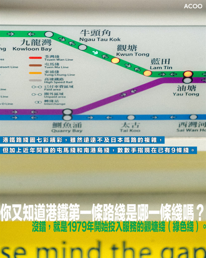 港鐵路綫圖七彩繽彩,雖然遠遠不及日本鐵路的複雜,但加上近年開通的屯馬綫和南港島綫,數數手指現在已有9條路綫。然而,你又知道港鐵第一條路綫是哪一條綫嗎?——沒錯,就是1979年開始投入服務的觀塘綫(綠色綫)。