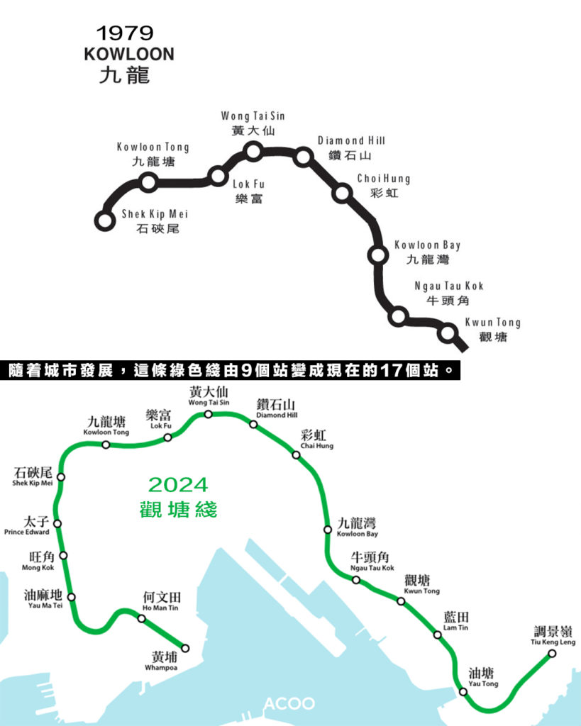 其實,綠色綫通車時,只有由石硤尾到觀塘9個站,其後逐漸擴展。直至東區海底隧道1989年通車後,觀塘綫更經東隧鐵路段伸延至港島鰂魚涌站,成為全港的第二條過海路綫,對於那時的港島人和東九人來說,實在方便得多。隨着城市發展,這條綠色綫由9個站變成現在的17個站。