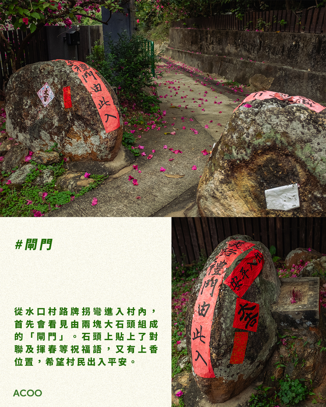 從水口村路牌拐彎進入村內,首先會看見由兩塊大石頭組成的「閘門」,村民稱之為「上麓」及「下麓」(即山上及山下之意)。這裏是通往村內的必經之路,由最早的定居者建立。石頭上貼上了對聯及揮春等祝福語,又有上香位置,希望村民出入平安。