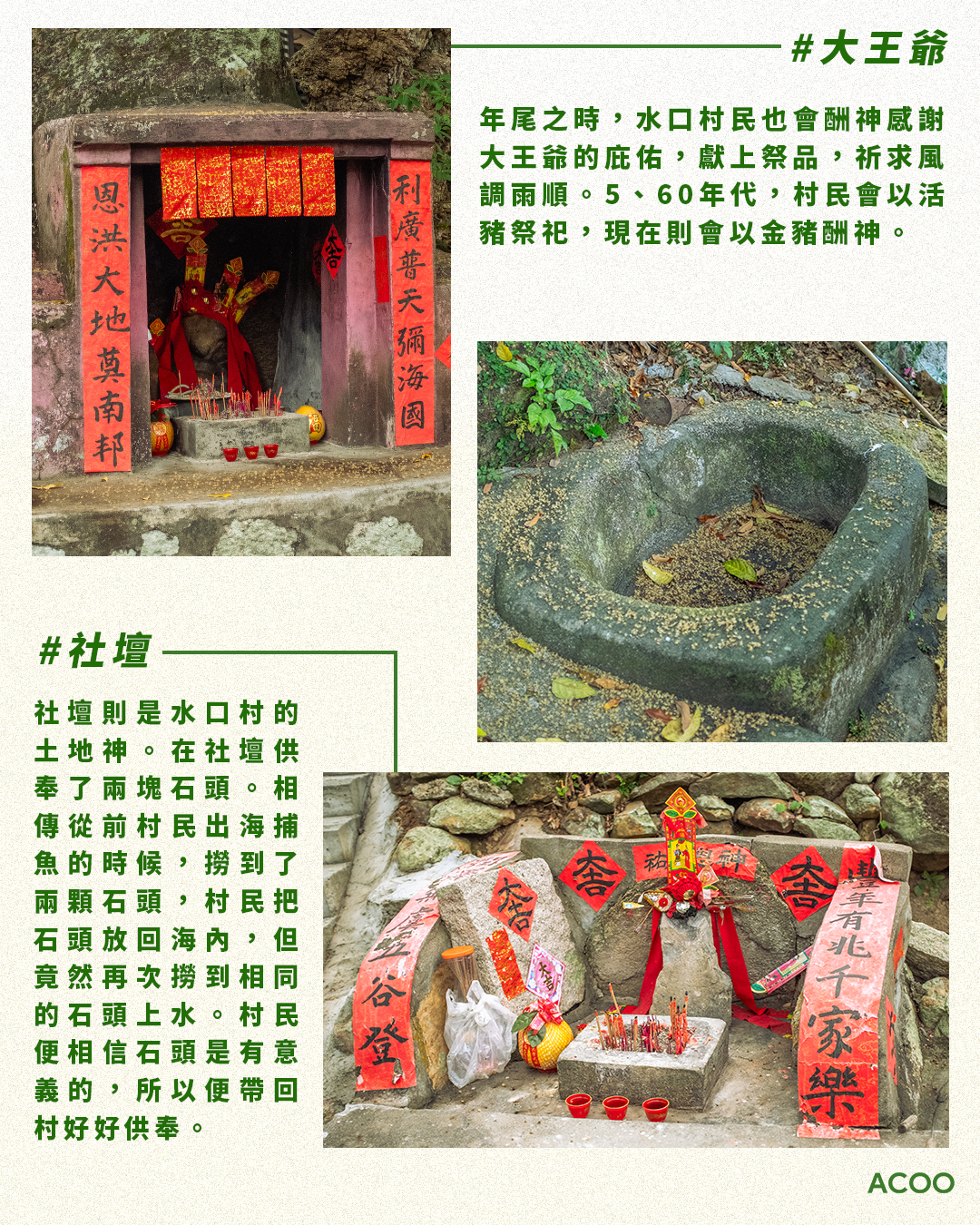 而社壇則是水口村的土地神。在社壇供奉了兩塊石頭。相傳從前村民出海捕魚的時候,撈到了兩顆石頭,村民把石頭放回海內,但竟然再次撈到相同的石頭上水。村民便相信石頭是有意義的,所以便帶回村好好供奉。