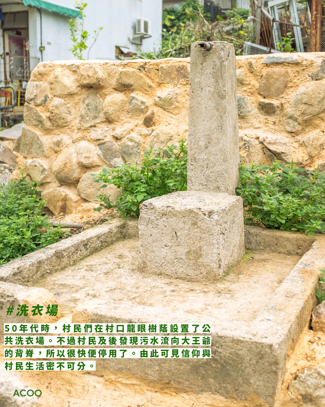 值得一提的是,由於80年代之前,水口仍未有自來水供應,所以50年代時,村民們在村口龍眼樹蔭設置了公共洗衣場。不過村民及後發現污水流向大王爺的背脊,所以很快便停用了。由此可見信仰與村民生活密不可分。