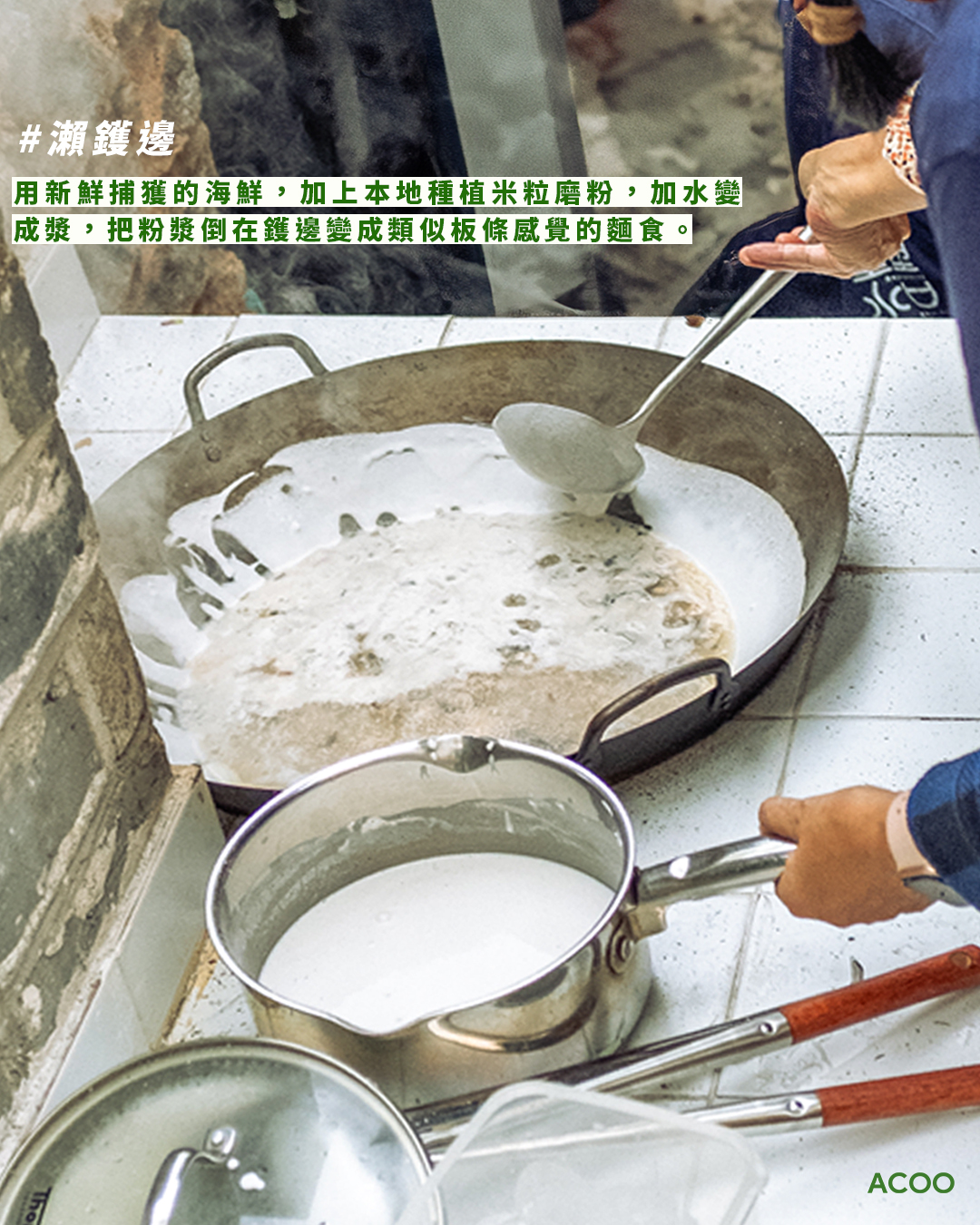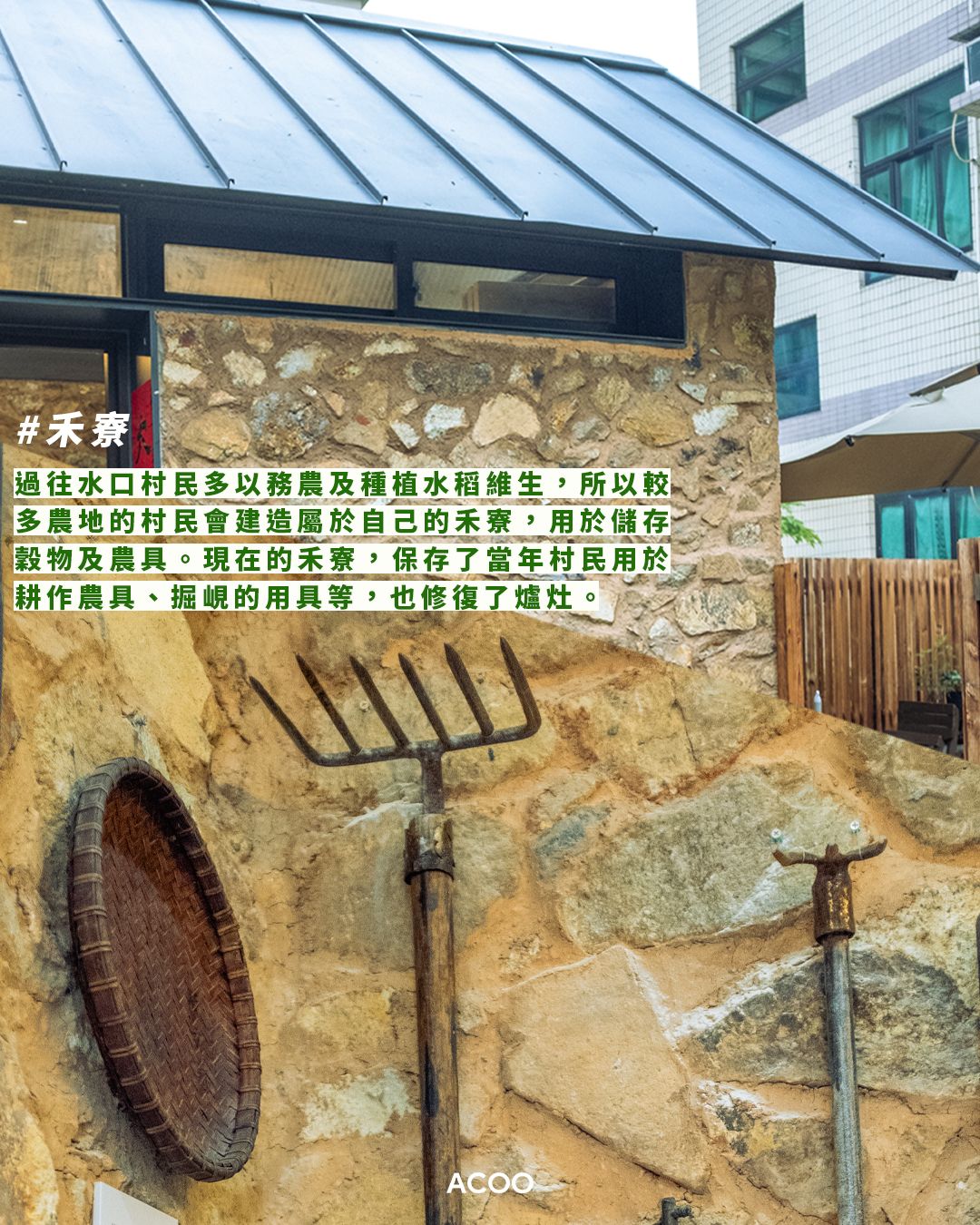 過往水口村民多以務農及種植水稻維生,所以較多農地的村民會建造屬於自己的禾寮,用於儲存穀物及農具。現在的禾寮,保存了當年村民用於耕作農具、掘峴的用具等,也修復了爐灶。現在,他們更會烹調傳統美食「瀨鑊邊」——予客人品嚐。用新鮮捕獲的海鮮,加上本地種植米粒磨粉,加水變成漿,把粉漿倒在鑊邊變成類似板條感覺的麵食。