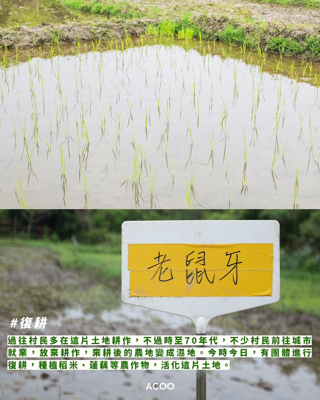 水口村被群山包圍,水口溪流是這條村的命脈。除此以外,水口還有泥灘、濕地、紅樹林等多種景觀,生態多樣性高。過往村民多在這片土地耕作,不過時至70年代,不少村民前往城市就業,放棄耕作,棄耕後的農地變成濕地。今時今日,有團哋進行復耕,種植稻米、蓮藕等農作物,活化這片土地。
