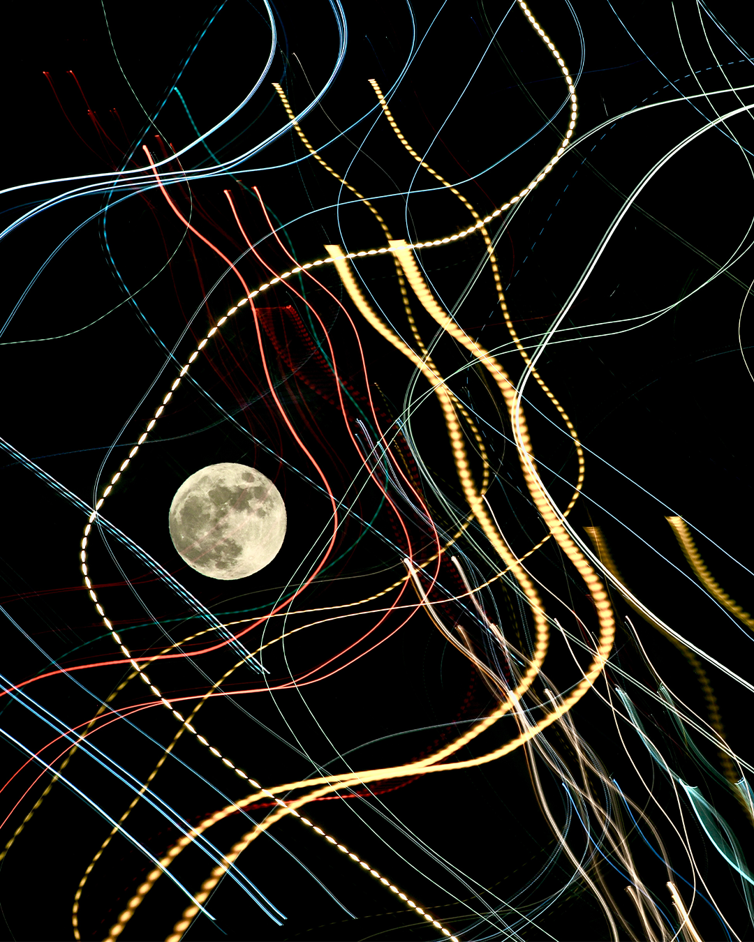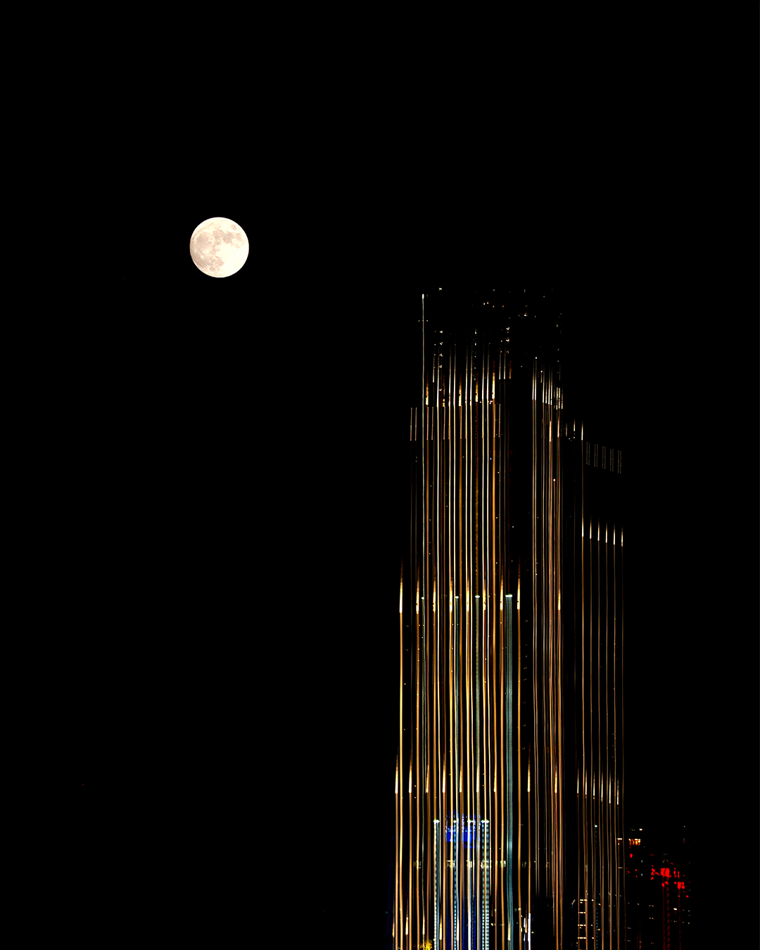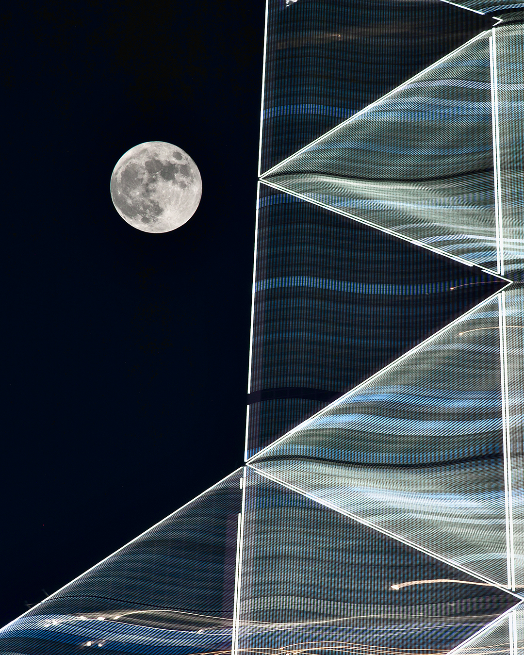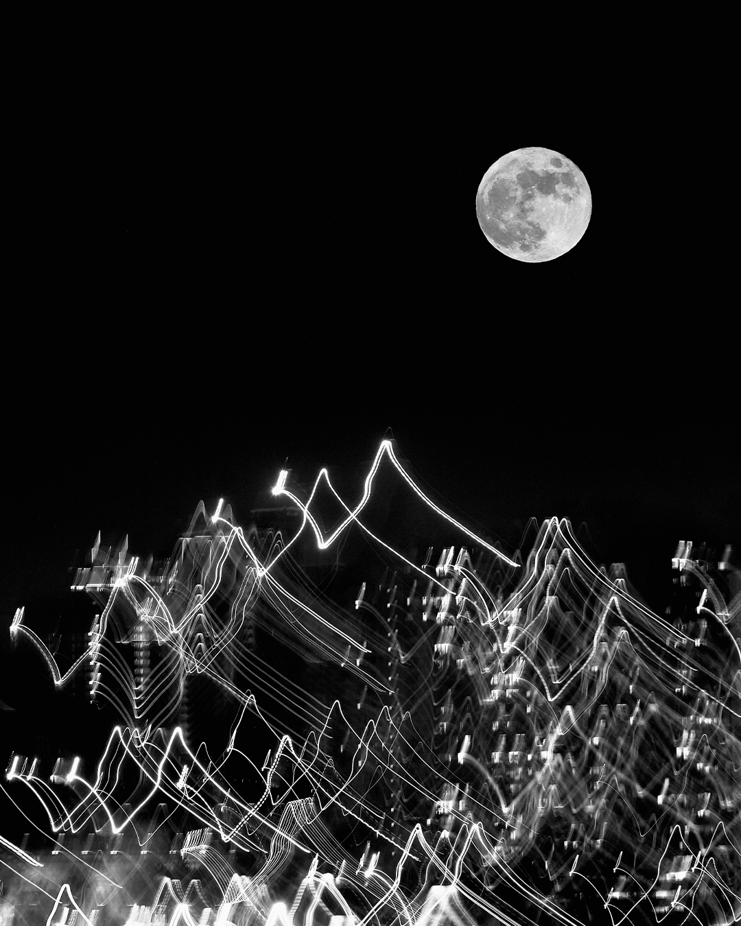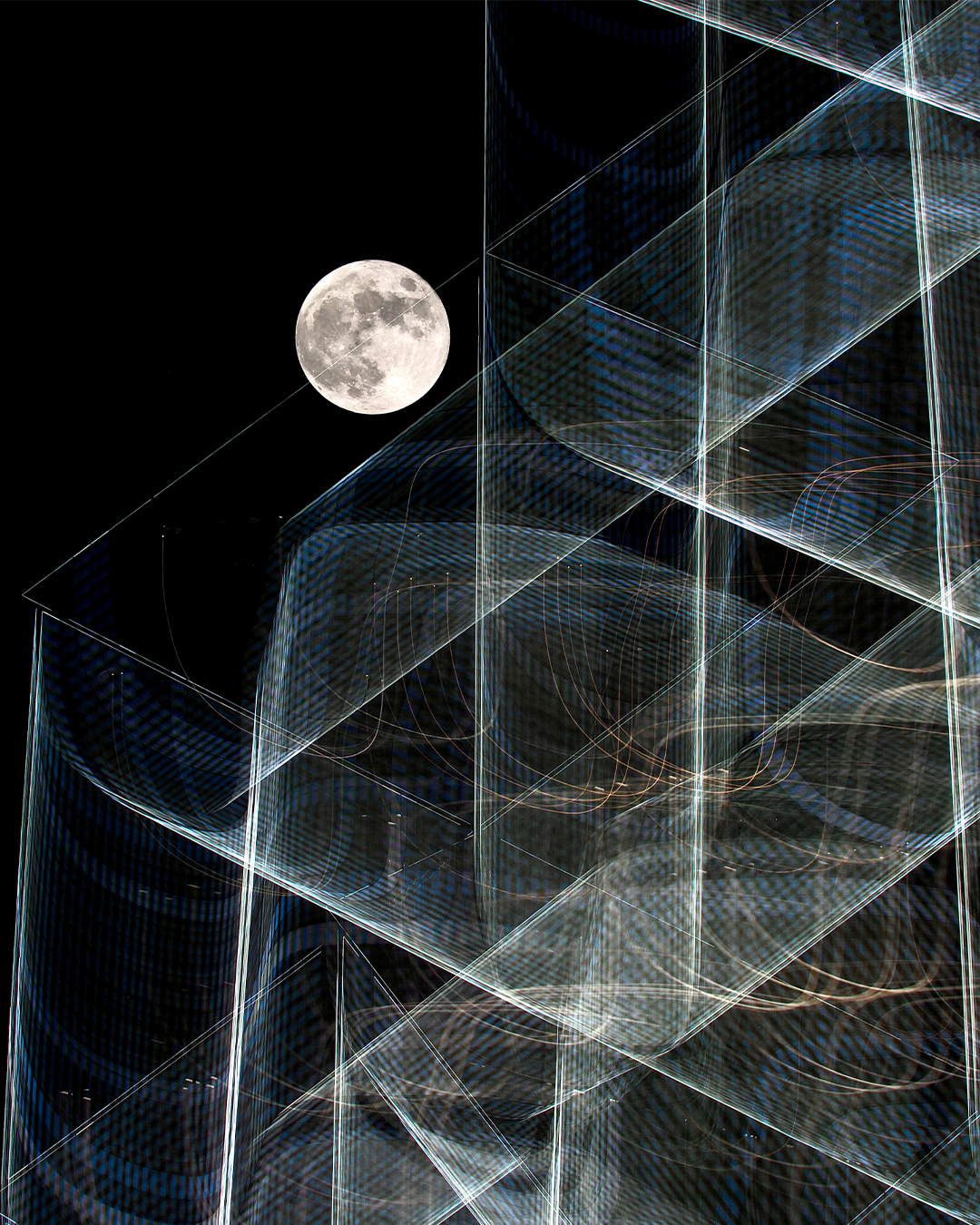 這次Jeff在中環NUOVO舉辦攝影展,作品透過探索多種雙重曝光技術、「故意模糊」和「刻意移動相機」,捕捉圓月及香港的不同光線。他作品呈現不同的建築物在空間裏互動的張力;而交叉相疊的建築物,構成一幅又一幅的剪影或幾何拼貼圖,將月亮與城市景觀和建築形態微妙結合,構成一幀幀美術攝影。