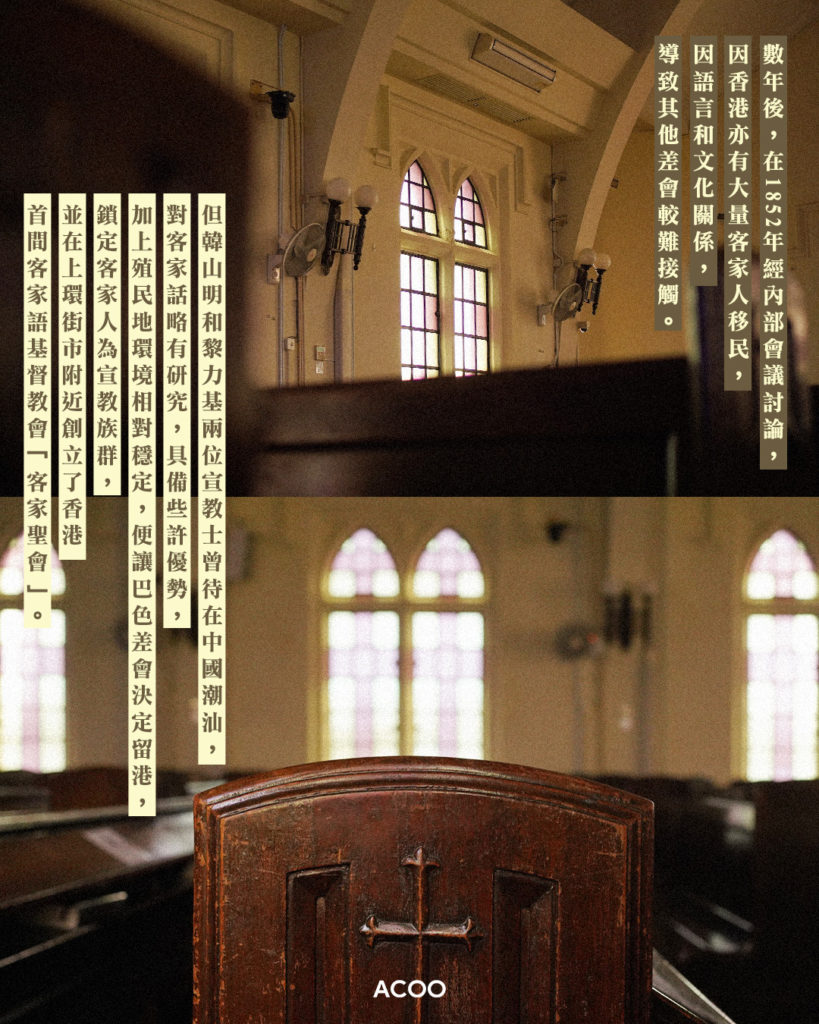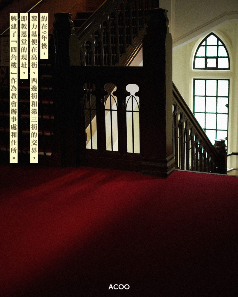 數年後,在1852年經內部會議討論,因香港亦有大量客家人移民,因語言和文化關係,導致其他差會較難接觸。但韓山明和黎力基兩位宣教士曾待在中國潮汕,對客家話略有研究,具備些許優勢,加上殖民地環境相對穩定,便讓巴色差會決定留港,鎖定客家人為宣教族群,並在上環街市附近創立了香港首間客家語基督教會「客家聖會」。約在9年後,黎力基便在高街、西邊街和第三街的交界,即教恩堂的現址,興建了「四角樓」作為教會辦事處和住所。
