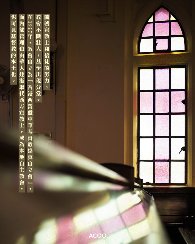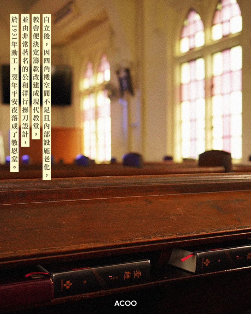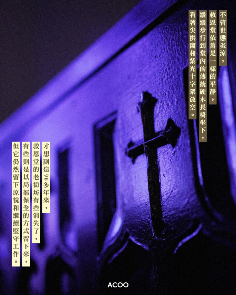 不管世態炎涼,救恩堂依舊是一樣的平靜,緩緩步行到堂內的傳統硬木長椅坐下,看着尖拱窗和紫光十字架放空。才想到這90多年來,救恩堂的老街坊有些消失了,有些則是以局部保全的方式留下來,但它仍然留下原貌和繼續堅守工作。
