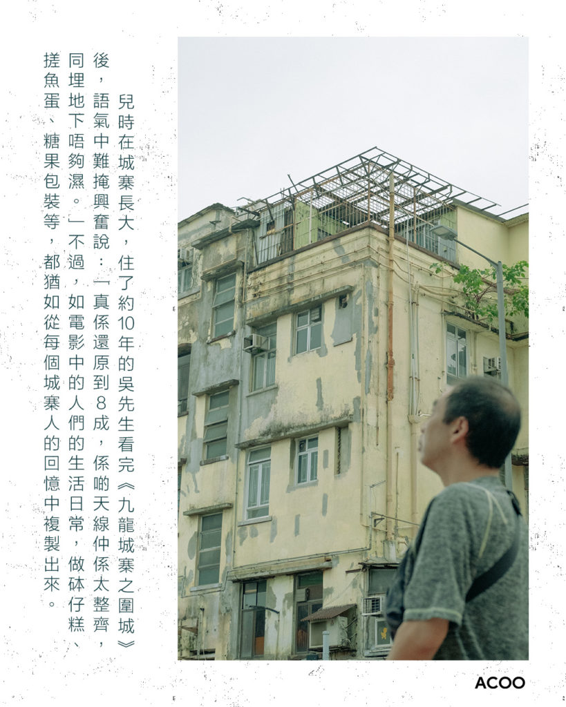 由鄭保瑞執導的《九龍城寨之圍城》上映近2星期,乘着電影的口碑和票房,讓這片昔日埋藏在九龍城的方寸之地,再次回到大眾的目光之下,備受關注。兒時在城寨長大,住了約10年的吳先生看過電影,語氣中難掩興奮說:「真係還原到8成,係啲天線仲係太整齊,同埋地下唔夠濕。」但人們做砵仔糕、搓魚蛋、糖果包裝及環境,都猶如從每個城寨人的回憶中複製出來,他說:「以前最出名係出廁所泵!」