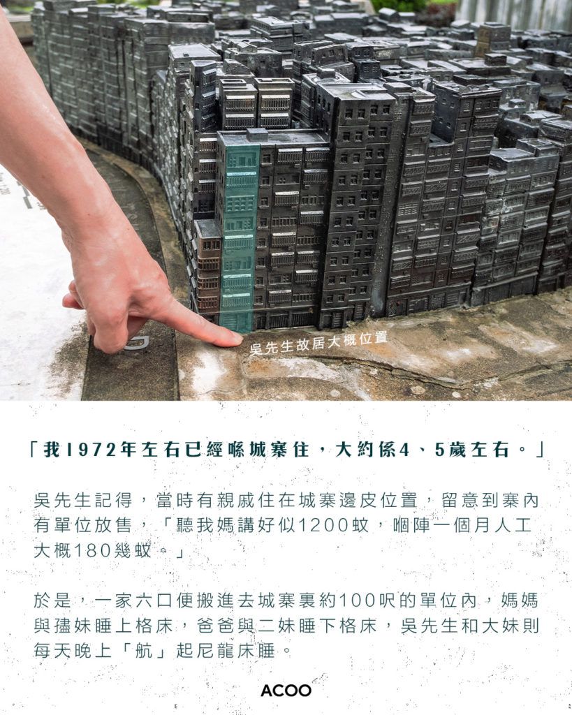 「我1972年左右已經喺城寨住,大約係4、5歲左右。」吳先生記得,當時有親戚住在城寨邊皮位置,留意到寨內有單位放售,「聽我媽講好似1200蚊,嗰陣一個月人工大概180幾蚊。」於是,一家六口便搬進去城寨裏約100呎的單位內,媽媽與孻妹睡上格床,爸爸與二妹睡下格床,吳先生和大妹則每天晚上「航」起尼龍床睡。