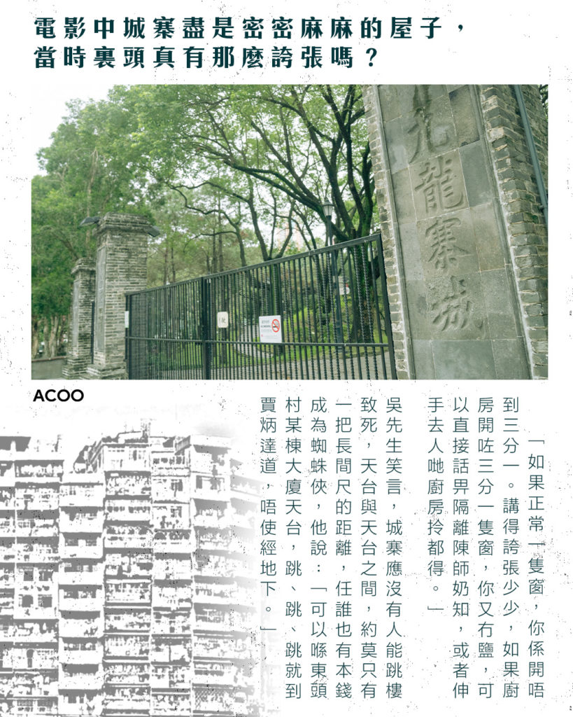 看到電影中密密麻麻的屋子,好奇當時裏頭真有那麼誇張嗎?「如果正常一隻窗,你係開唔到三分一。講得誇張少少,如果廚房開咗三分一隻窗,你又冇鹽,可以直接話畀隔離陳師奶知,或者伸手去人哋廚房拎都得。」吳先生笑言,城寨應沒有人能跳樓致死,天台與天台之間,約莫只有一把長間尺的距離,任誰也有本錢成為蜘蛛俠,他說:「可以喺東頭村某棟大廈天台,跳、跳、跳就到賈炳達道,唔使經地下。」
