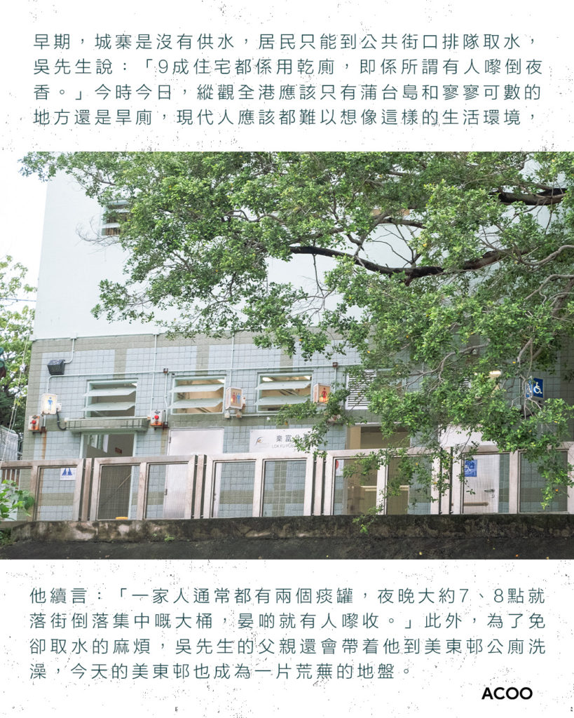 早期,城寨是沒有供水,居民只能到公共街口排隊取水,吳先生說:「9成住宅都係用乾廁,即係所謂有人嚟倒夜香。」今時今日,縱觀全港應該只有蒲台島和寥寥可數的地方還是旱廁,現代人應該都難以想像這樣的生活環境,他續言:「一家人通常都有兩個痰罐,夜晚大約7、8點就落街倒落集中嘅大桶,晏啲就有人嚟收。」此外,為了免卻取水的麻煩,吳先生的父親還會帶着他到美東邨公廁洗澡,今天的美東邨也成為一片荒蕪的地盤。