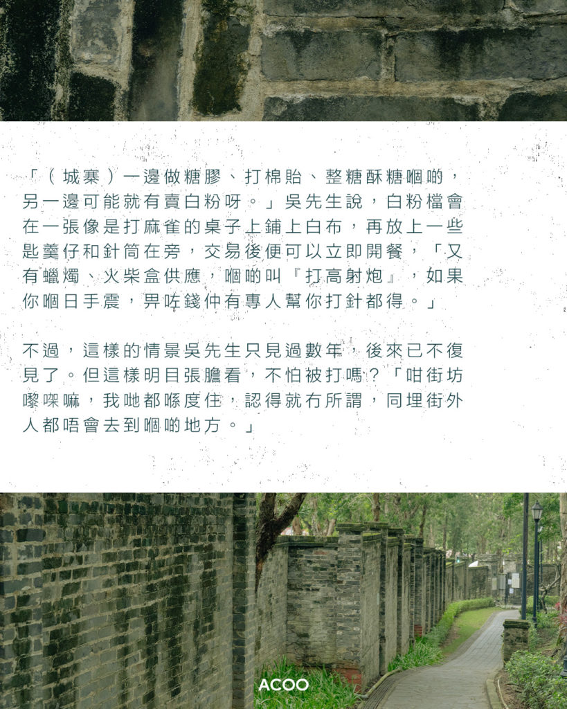 「(城寨)一邊做糖膠、打棉貽、整糖酥糖嗰啲,另一邊可能就有賣白粉呀。」吳先生說,白粉檔會在一張像是打麻雀的桌子上鋪上白布,再放上一些匙羹仔和針筒在旁,交易後便可以立即開餐,「又有蠟燭、火柴盒供應,嗰啲叫『打高射炮』,如果你嗰日手震,畀咗錢仲有專人幫你打針都得。」不過,這樣的情景吳先生只見過數年,後來已不復見了。但這樣明目張膽看,不怕被打嗎?「咁街坊嚟㗎嘛,我哋都喺度住,認得就冇所謂,同埋街外人都唔會去到嗰啲地方。」