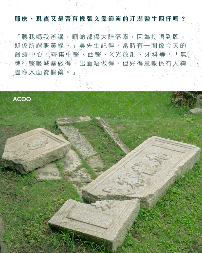 那麼,現實又是否有像張文傑飾演的江湖醫生四仔嗎?「聽我媽我爸講,嗰啲都係大陸落嚟,因為拎唔到牌,即係所謂嘅黃綠。」吳先生記得,當時有一間像今天的醫療中心,齊集中醫、西醫、X光放射、牙科等,「無牌行醫喺城寨做得,出面唔做得,但好得意嘅係冇人夠膽喺入面賣假藥。」