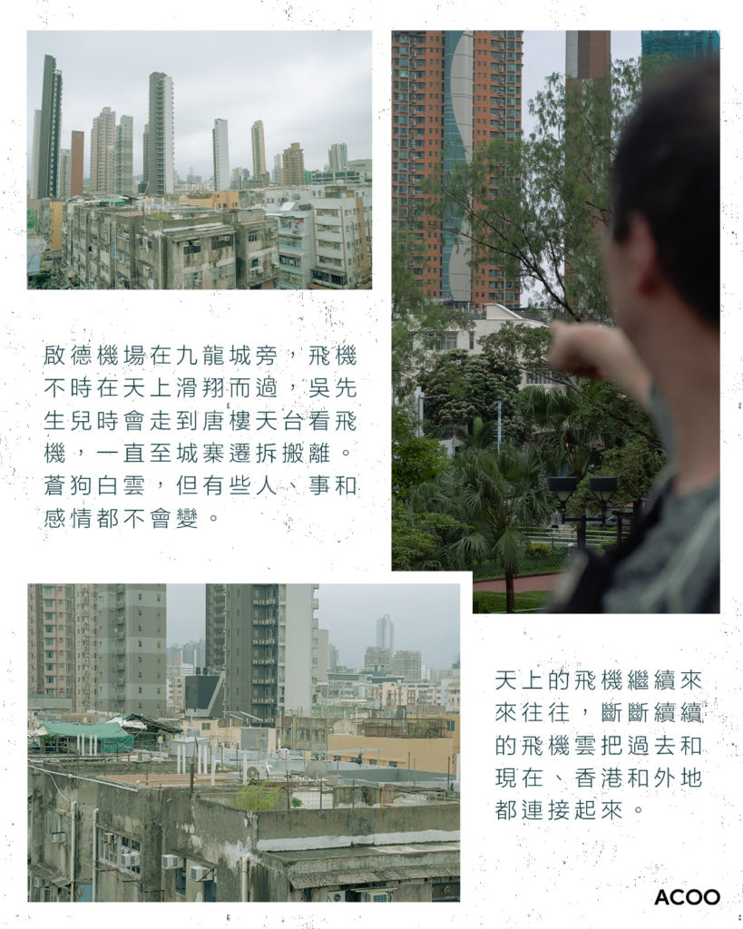 就像電影一樣,啟德機場就在九龍城旁,飛機不時就在天上滑翔而過,吳先生不時走到唐樓天台看飛機,一直至城寨遷拆搬離。蒼狗白雲,但有些人、事和感情都不會變。