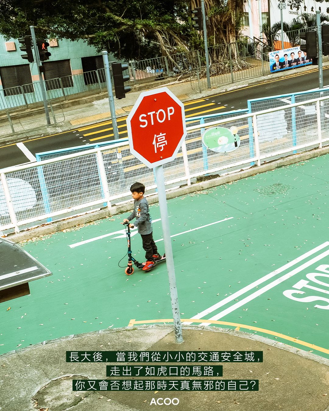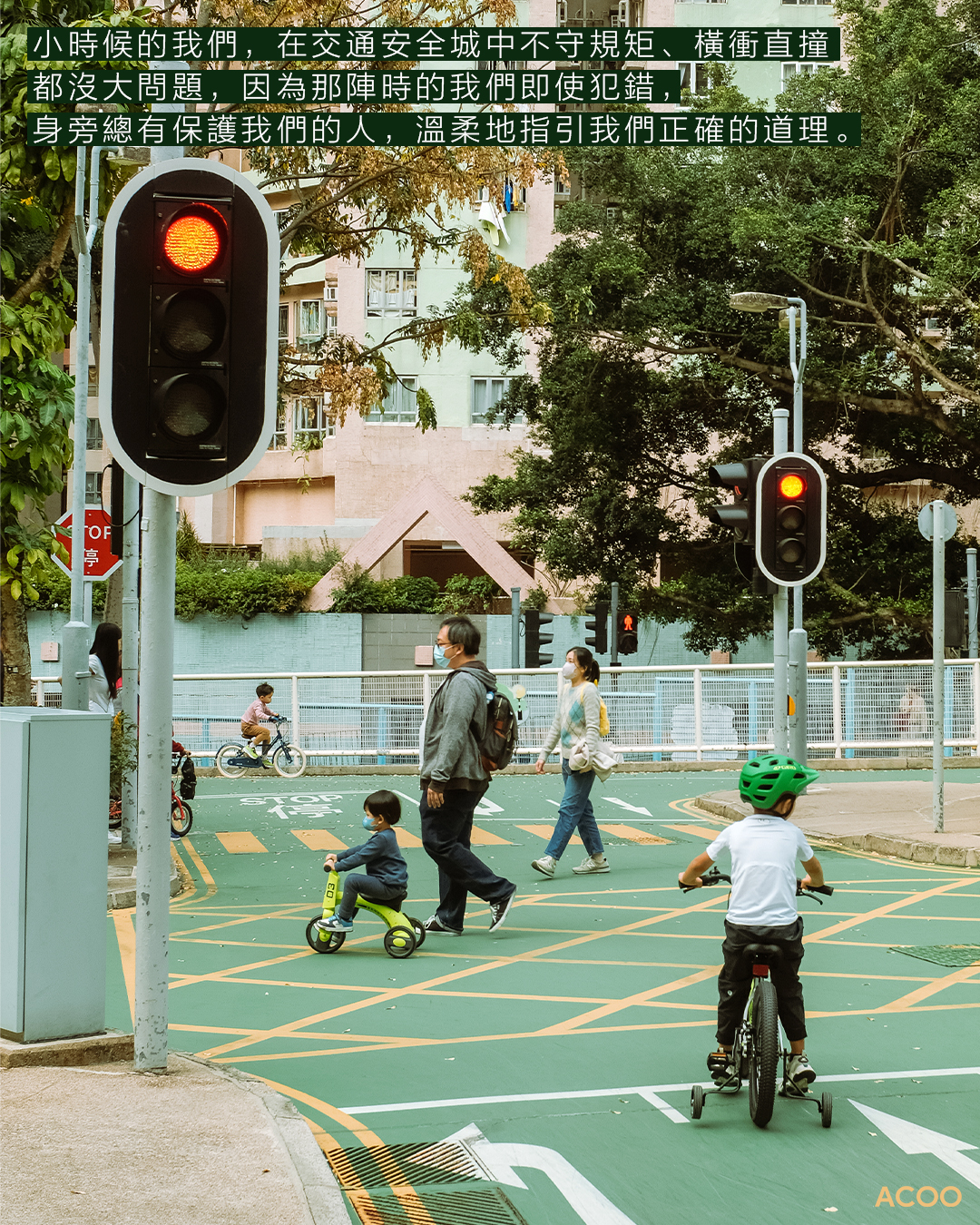 小時候的我們,在交通安全城中不守規矩、橫衝直撞都沒大問題,因為那陣時的我們即使犯錯,身旁總有保護我們的人,溫柔地指引我們正確的道理。長大後,當我們從小小的交通安全城走出了如虎口的馬路,你又會否想起那時天真無邪的自己?