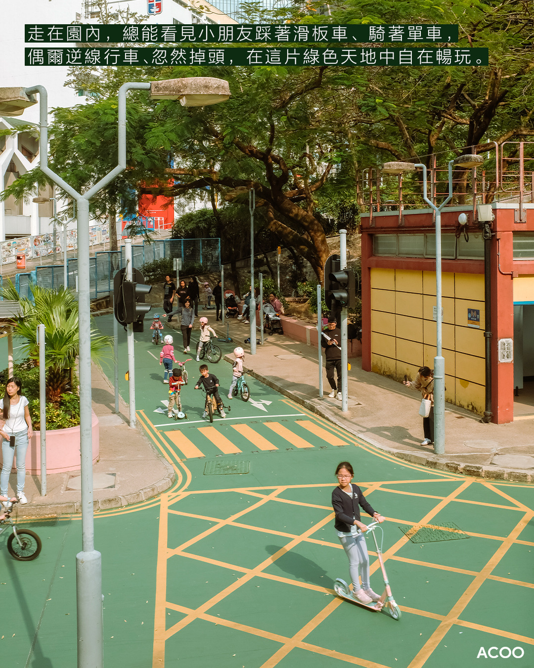 現在,香港有3個交通安全城,分別位於北角百福道、觀塘秀明道和沙田崗背街。現在的交通安全城依然保持着它的教育功能,但多了幾分休閒的氣息。走在園內,總能看見小朋友踩著滑板車、騎著單車,偶爾逆線行車、忽然掉頭,在這片綠色天地中自在暢玩。