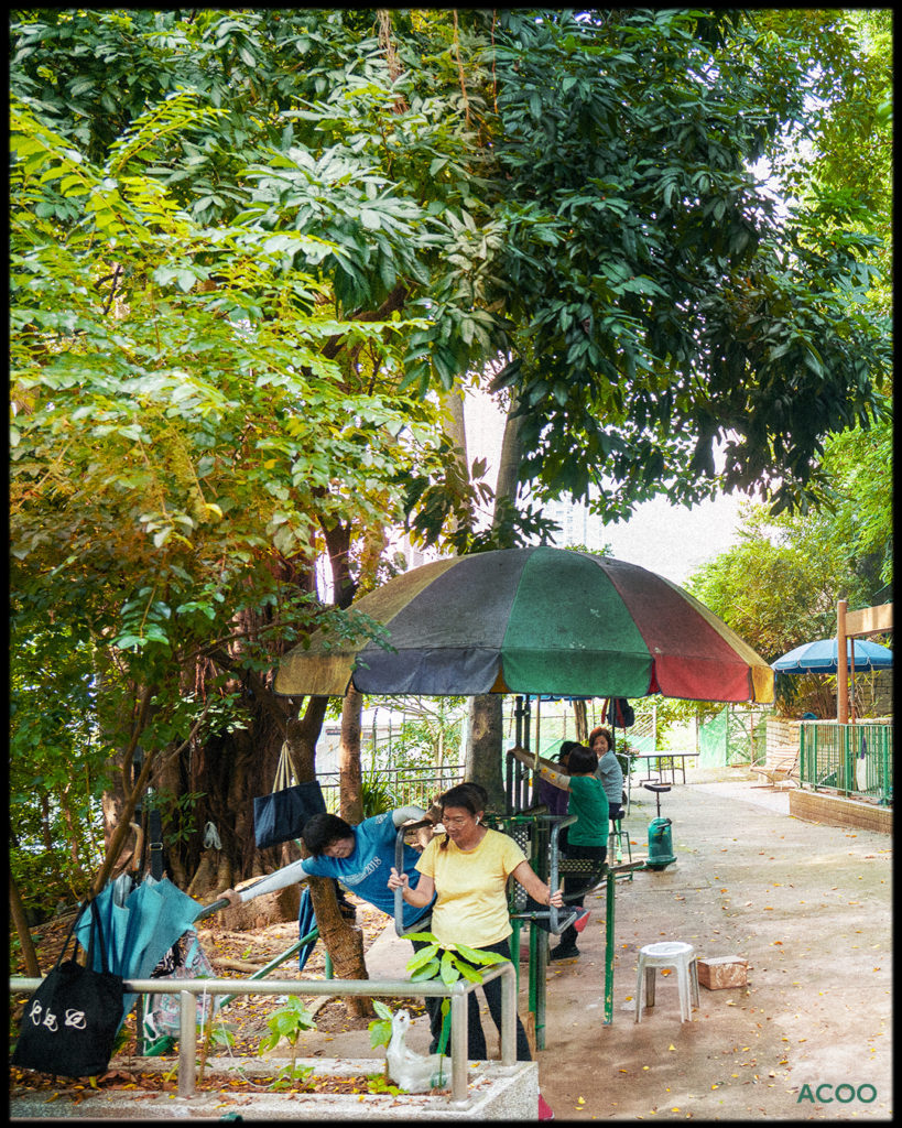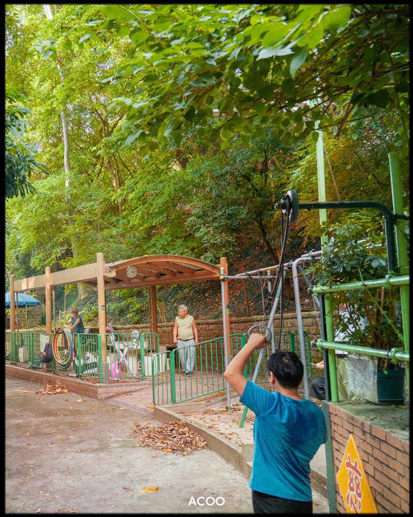 有趣的是,使用健身設施的都是稍有年紀的人,筆者使好奇問:「這都可以隨便用的嗎?」一旁正在踩單車機的熱心姨姨馬上回答:「當然可以!不用錢的,隨便玩!」原來這裏的健身器材,全都是出自一位沙士康復者蘇志強之手,當年他病癒後在主教山做復康訓練,沐浴在山林中乾淨的空氣與芬多精,還有怡人清幽的環境中,使他慢慢重拾健康。之後,他便一步一腳印的在山上,築建出一座屬於大家的健身樂園。