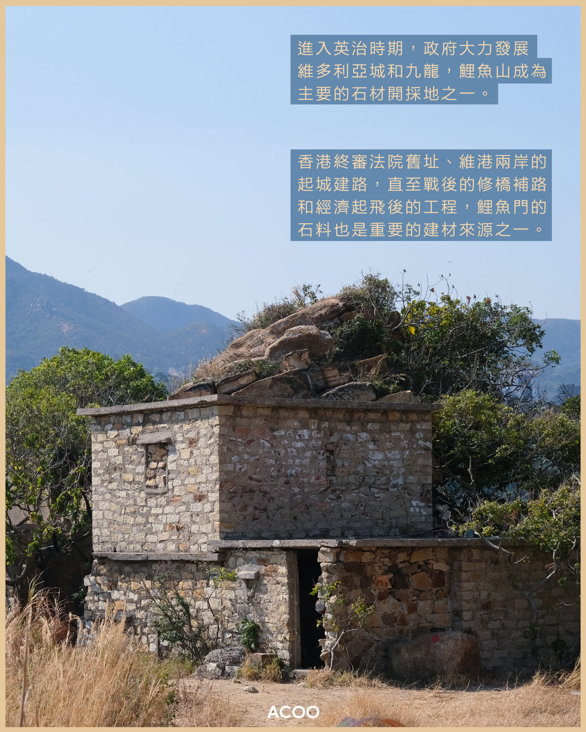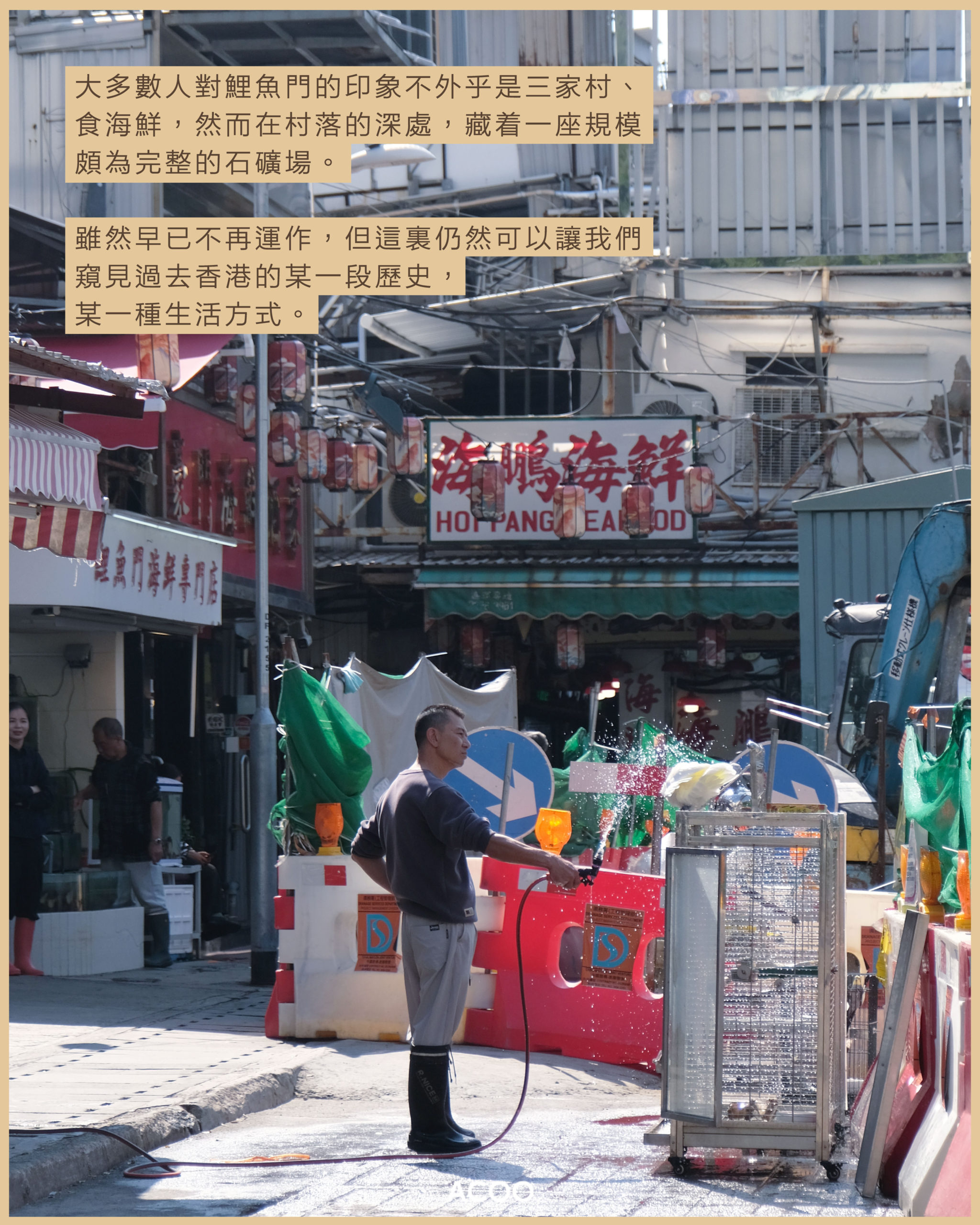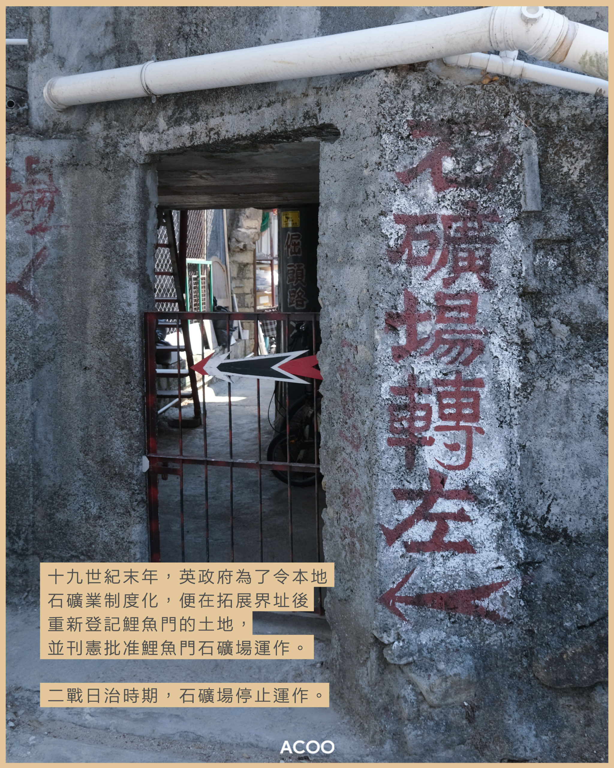 大多數人對鯉魚門的印象不外乎是三家村、食海鮮,然而在村落的深處,藏着一座規模頗為完整的石礦場,有石碼頭、石屋、石牆等混凝土構築物。這座石礦場,早在清朝時期已開始產出花崗岩,英治時期的香港終審法院舊址、維港兩岸的起城建路,直至戰後的修橋補路和經濟起飛的工程,鯉魚門的石料也是重要的建材來源之一。