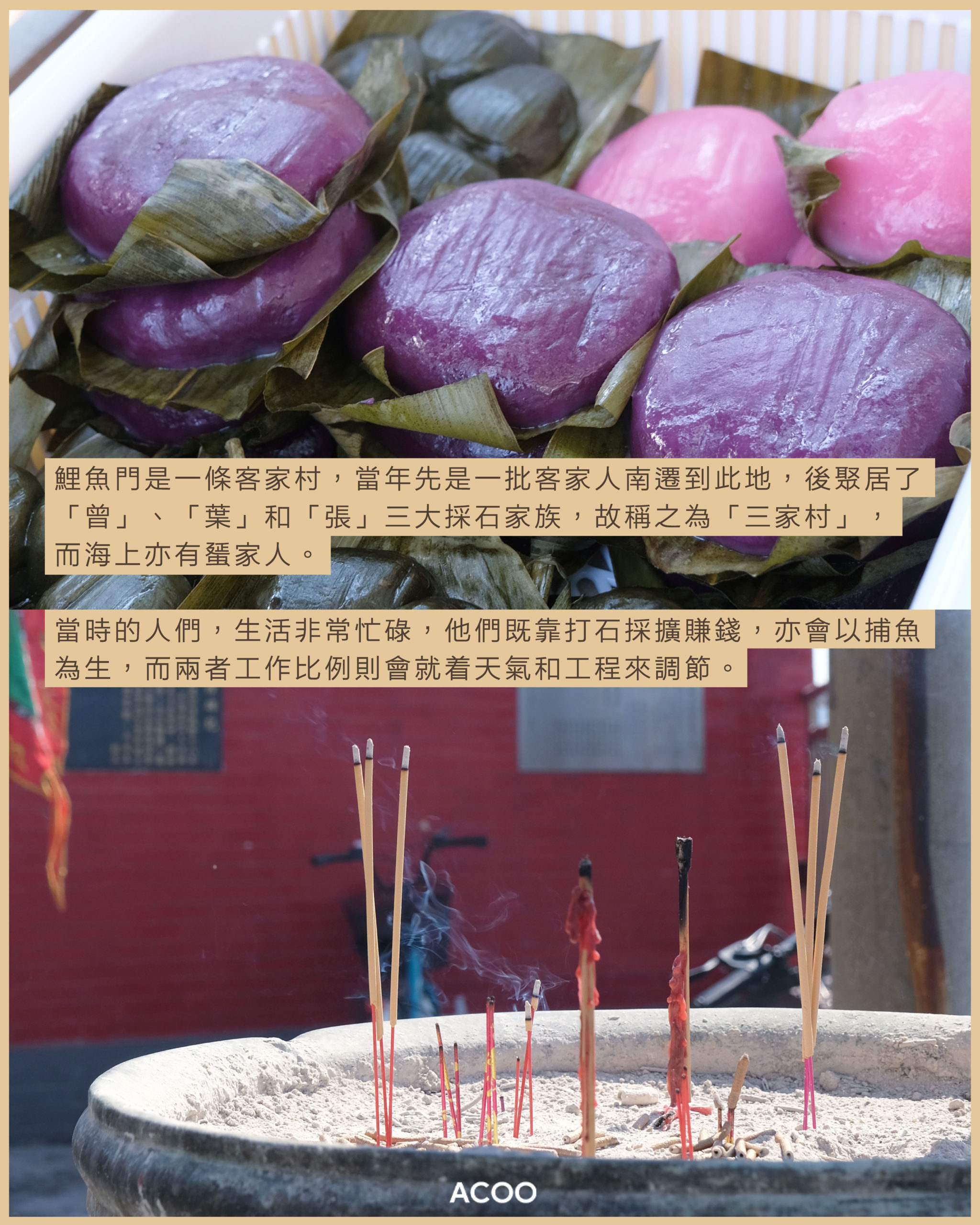 鯉魚門是一條客家村,當年先是一批客家人南遷到此地,後聚居了「曾」、「葉」和「張」三大採石家族,故稱之為「三家村」,而海上亦有蜑家人。