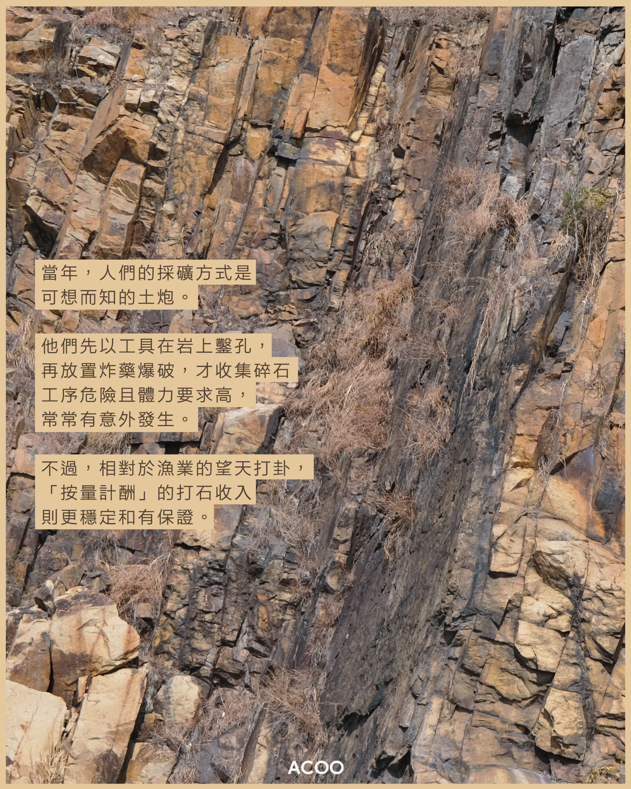 當時的人們,生活非常忙碌,他們既靠打石採擴賺錢,亦會以捕魚為生,而兩者工作比例則會就着天氣和工程來調節。當年,人們的採礦方式是可想而知的土炮,他們先以工具在岩上鑿孔,再放置炸藥爆破,才收集碎石,工序危險且體力要求高,常常有意外發生。不過,相對於漁業的望天打卦,「按量計酬」的打石收入則更穩定和有保證。