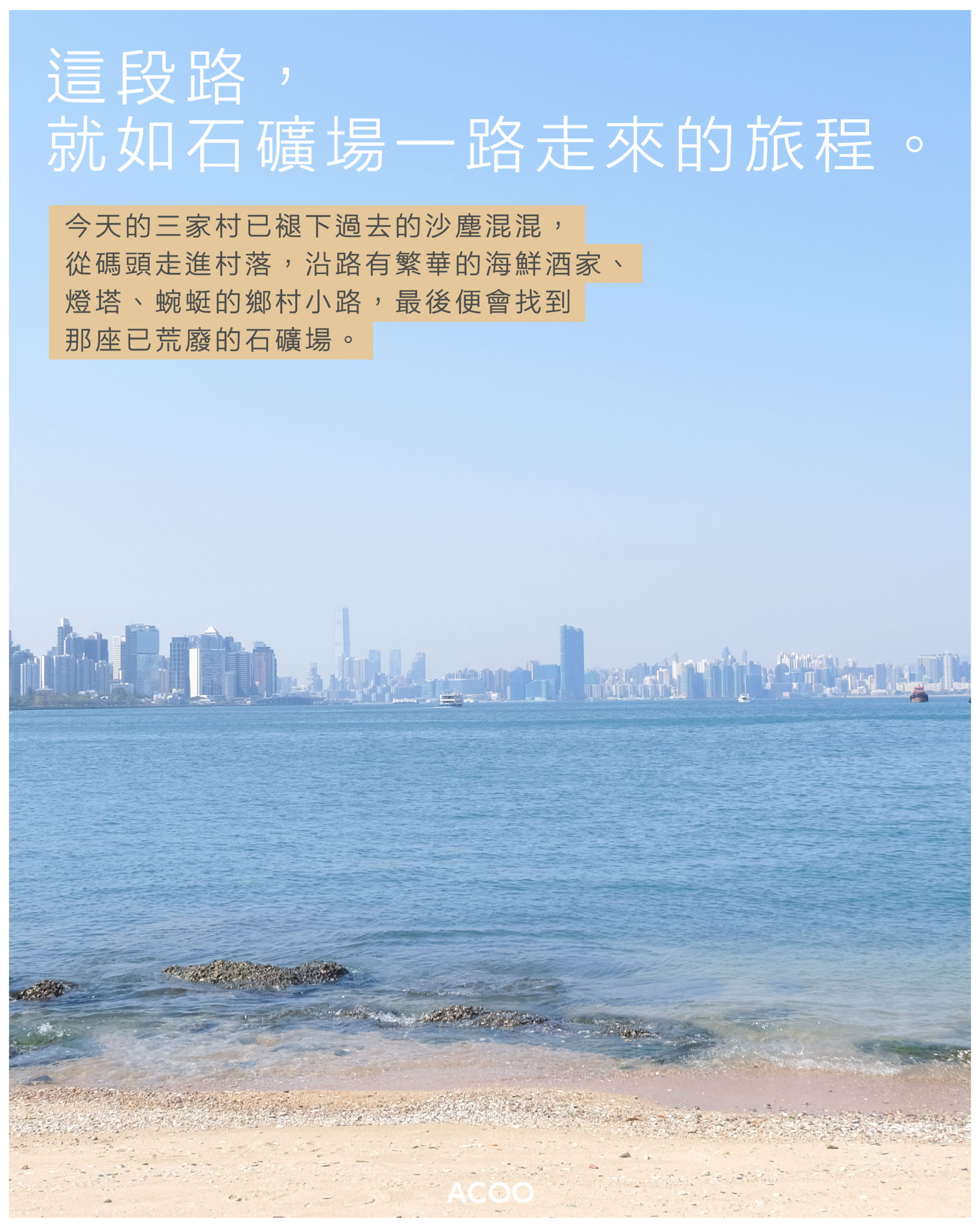 今天的三家村已褪下過去的沙塵混混,從碼頭走進村落,有擺賣茶果的小檔攤,各種顏色、不同口味帶着村落的回憶。沿路往深處走,有繁華的海鮮酒家、燈塔、蜿蜓的鄉村小路,最後便會找到那座已荒廢的石礦場。