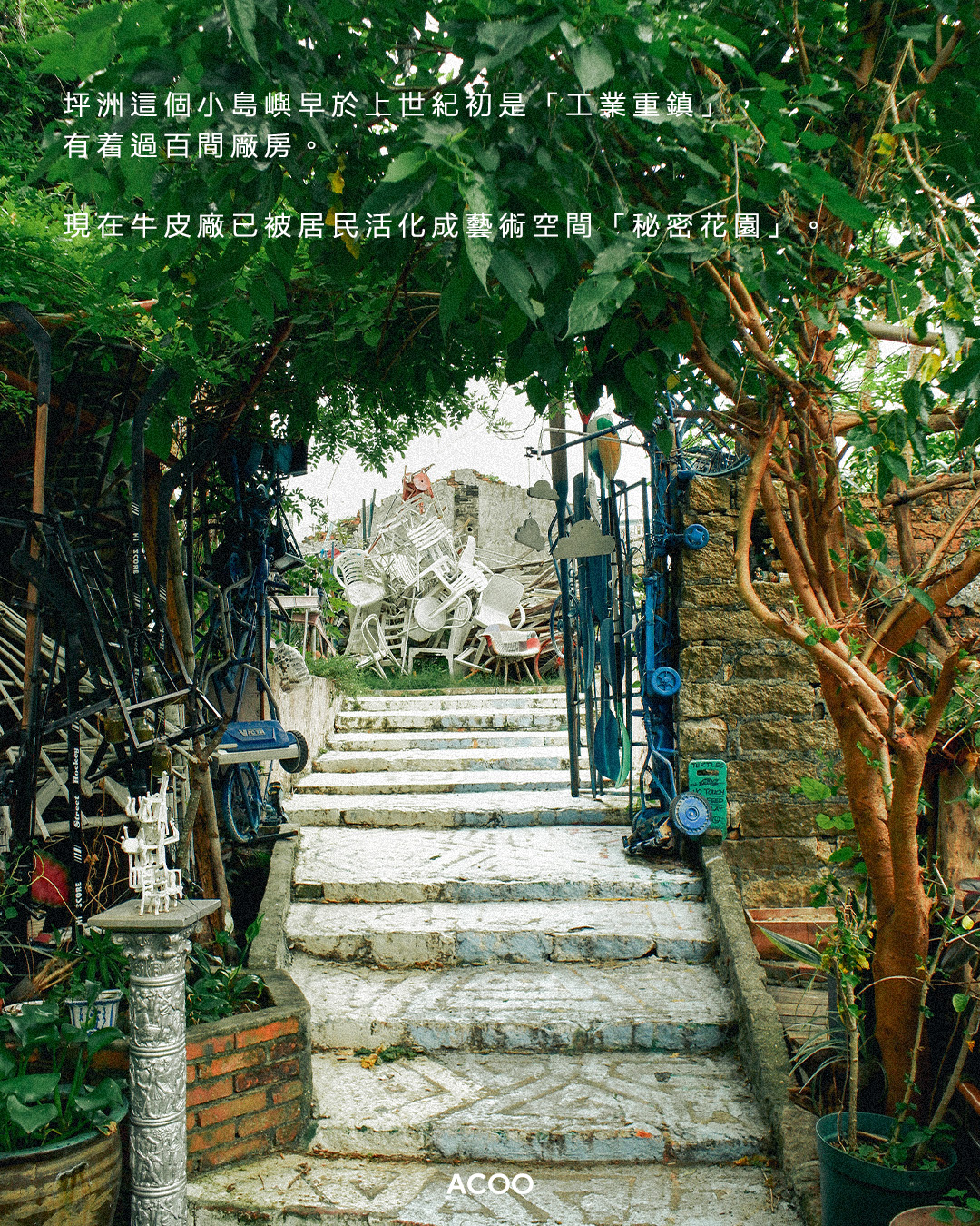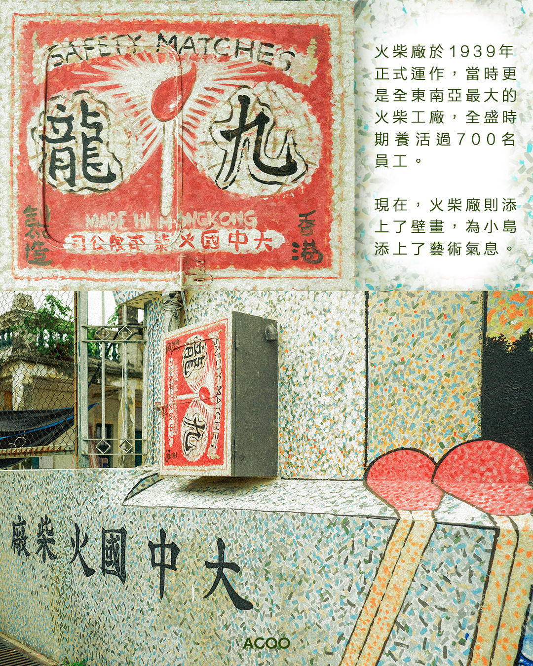 從碼頭起步,首先最吸睛的肯定是牛皮廠及大中國火柴廠這兩幢三級歷史建築。這個小島嶼早於上世紀初是「工業重鎮」,有着過百間廠房。全盛時期全島有高達十一間灰窯廠,而火柴廠於1939年正式運作,當時更是全東南亞最大的火柴工廠,全盛時期養活過700名員工。而現在牛皮廠已被居民活化成藝術空間「秘密花園」,火柴廠則添上了壁畫,為小島添上藝術氣息。
