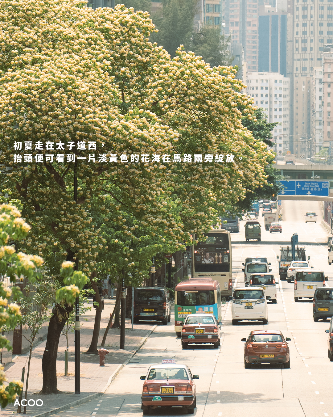 初夏走在太子道西,抬頭便可看到一片淡黃色的花海在馬路兩旁綻放,與午後的陽光相映成趣。