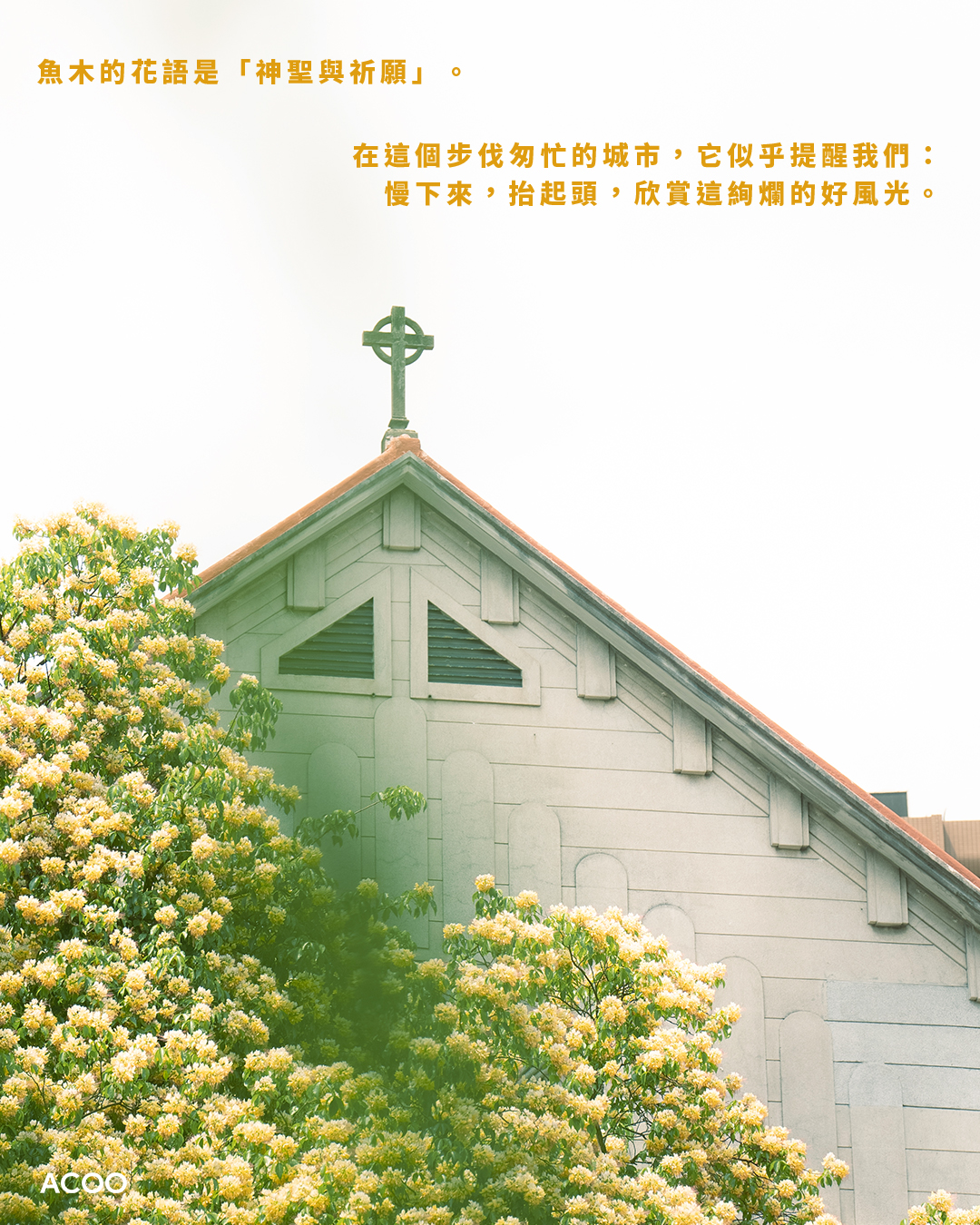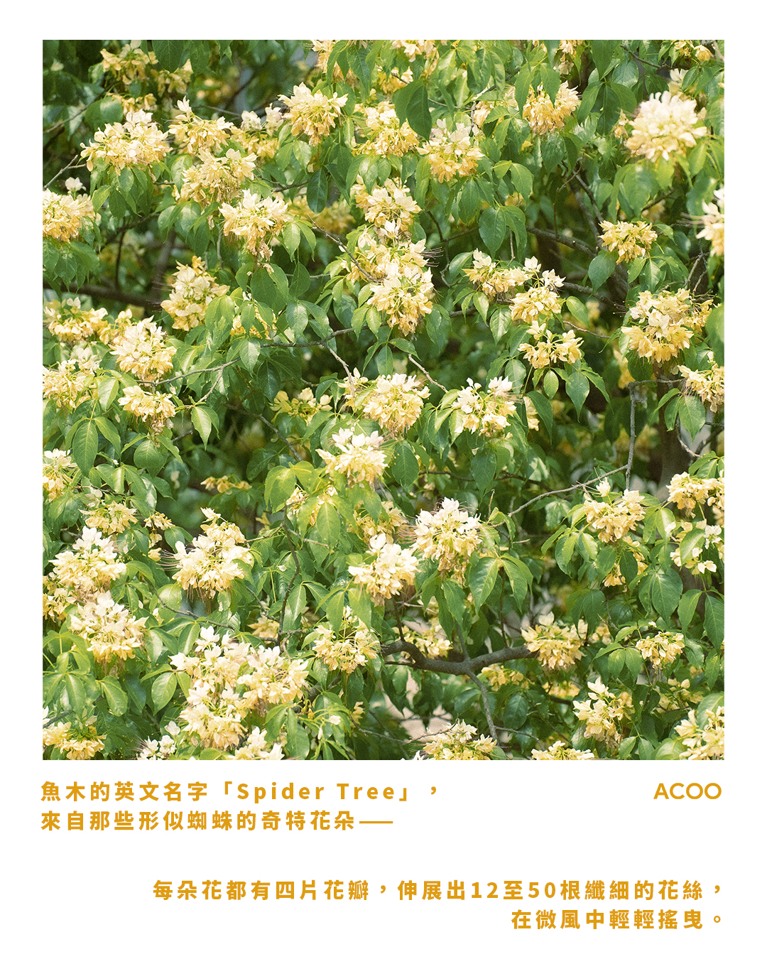 每年4月份,你總會在某個街頭的一隅看到這麼一片鵝蛋黃色花海。「魚木」這個名字,源於台灣漁民用它的木材刻成小魚,帶去海上捕魚的習慣;魚木的英文名字「Spider Tree」,則來自那些形似蜘蛛的奇特花朵。魚木的每朵花都有四片花瓣,伸展出12至50根纖細的花絲,在微風中輕輕搖曳。魚木還有個親切的名字,叫「樹頭菜」,因為它嫩嫩的葉子可以醃製成開胃小菜。