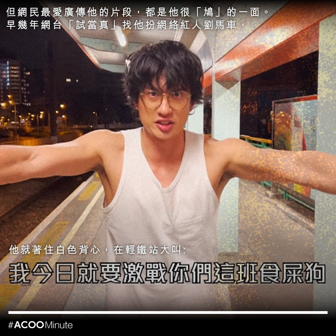 劉俊謙彈起後,社交平台Threads上出現劉俊謙的洗版潮,其中不少是考古他過往的影片。劉俊謙形象斯文,略帶憂鬱氣質,但網民最愛廣傳他的片段,都是他很「鳩」的一面。其實他幽默玩得的這一面,早已有跡可尋。早幾年網台「試當真」找他扮網絡紅人劉馬車,他就著住白色背心,在輕鐵站大叫「我今日要激戰你哋班食屎狗」,完全零偶包。另一條他在米線餐廳宣傳活動的片,他就恐怖情人上身,上一秒怒吼「你即刻過嚟同我食米線!」下一秒即以溫柔語調餵你食豬紅。連導演鄭保瑞對他的評價都是:「大家見佢靚靚仔仔咁,其實佢好鳩㗎。」這種反差,令人對他更著迷。