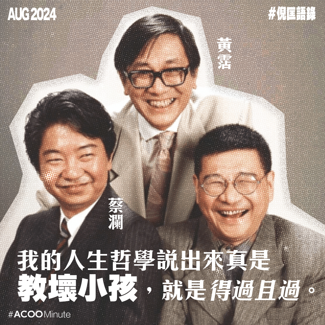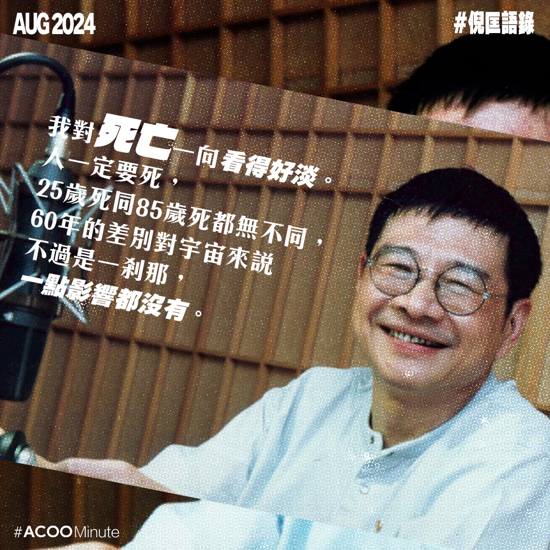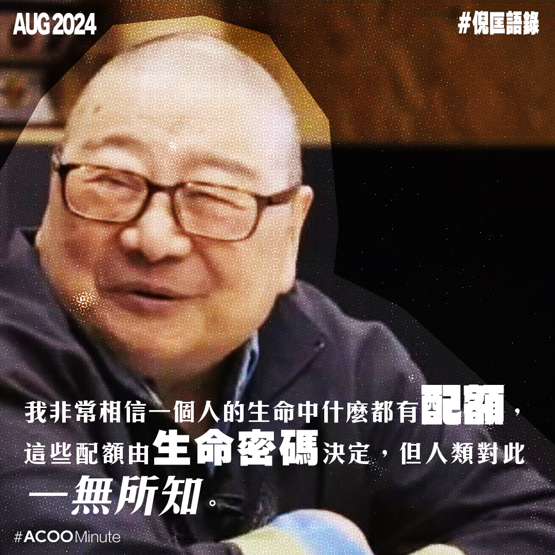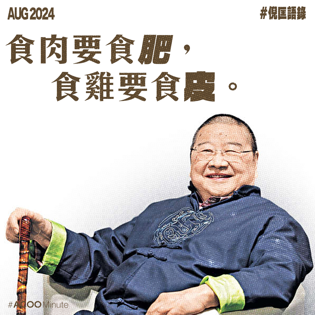 他相信命運是一早寫好的劇本,也相信一生很多事都有配額,用完就沒有。所以他的處世哲學就是,在未知的劇本中,盡情活得快樂自在。(也因此有「食肉要食肥,食雞要食皮」這句名言!)不過正如倪老所言,年輕人不需聽上一代人的說話,大家無須跟從誰的道路,即管找尋屬於自己生活的方式吧。