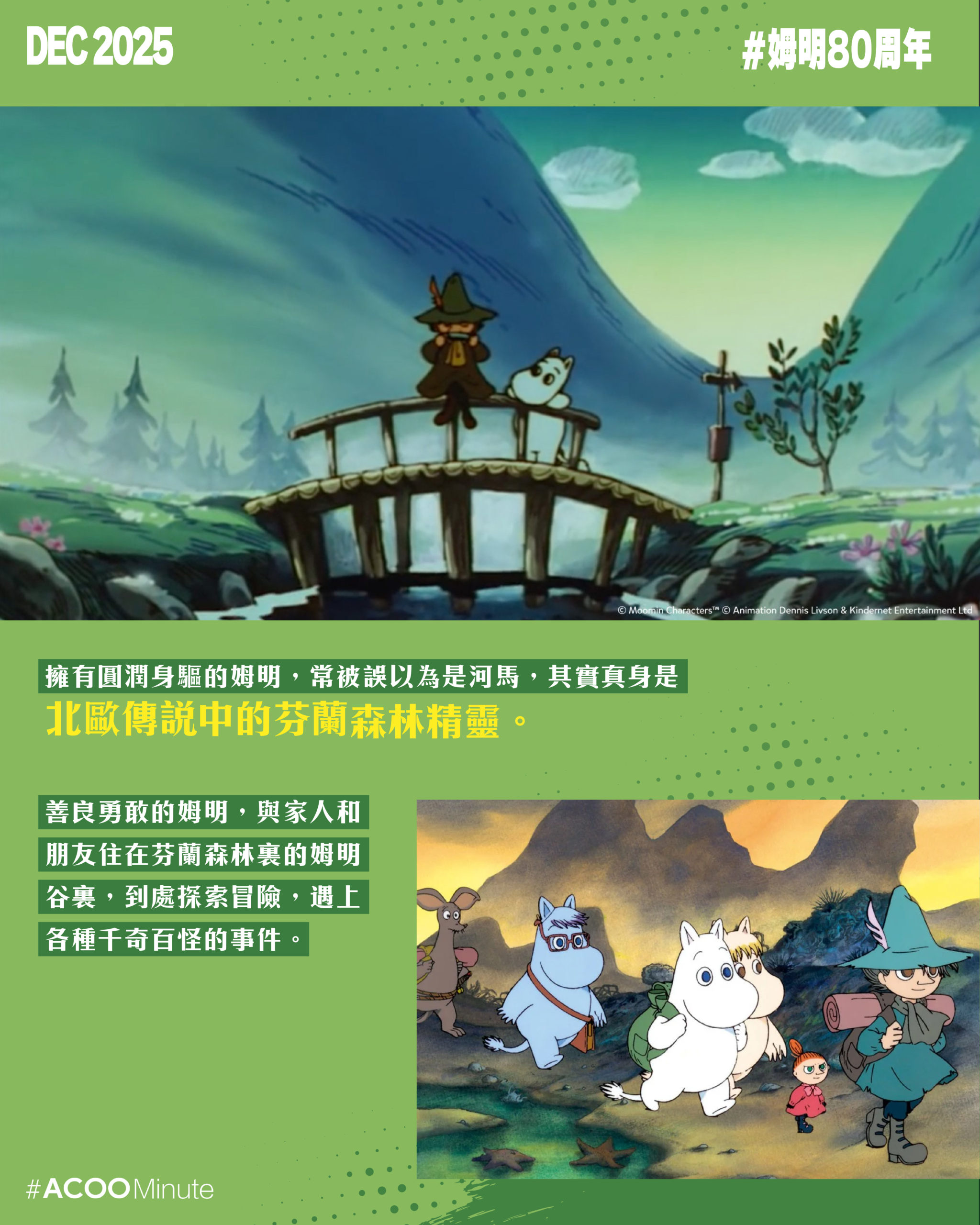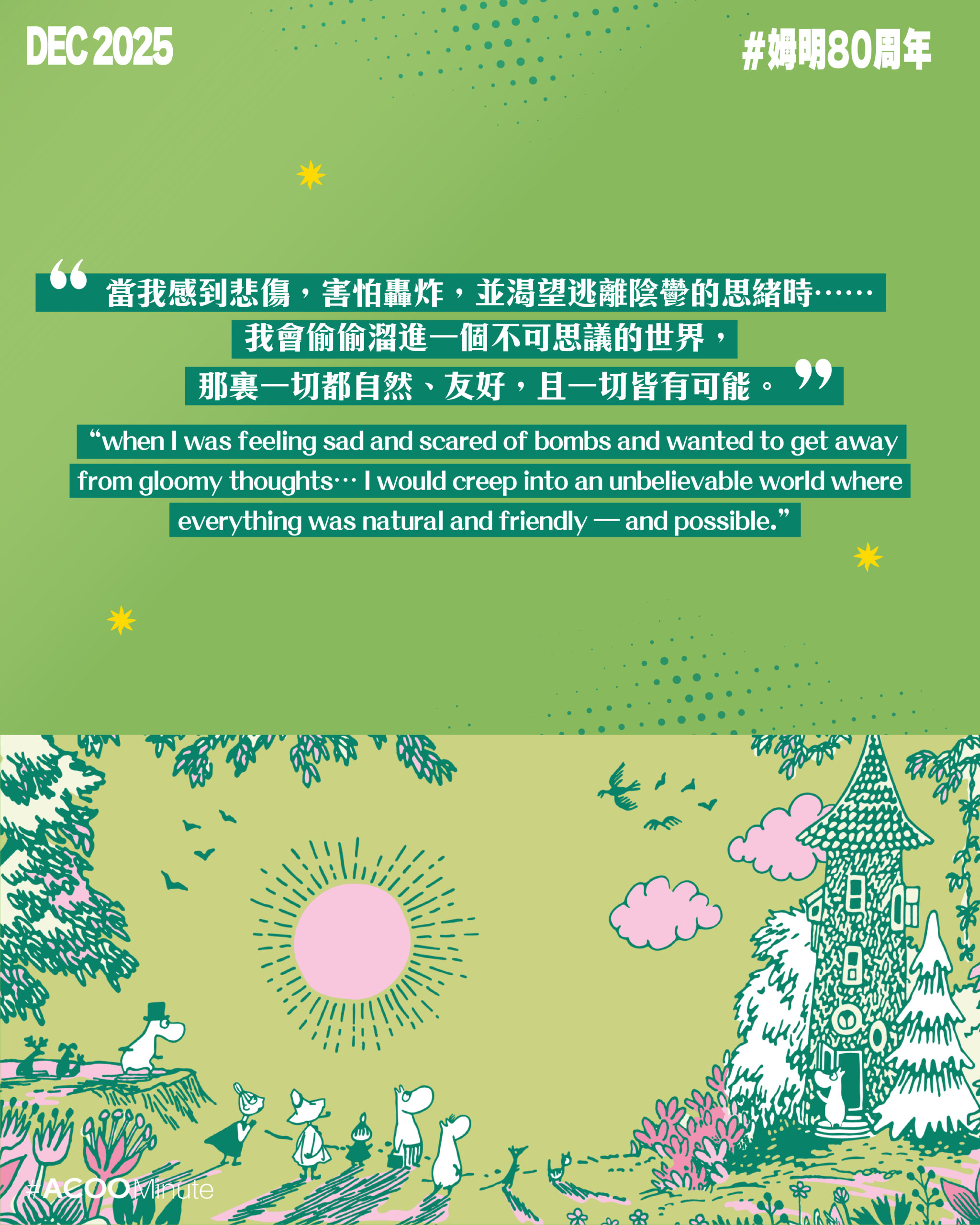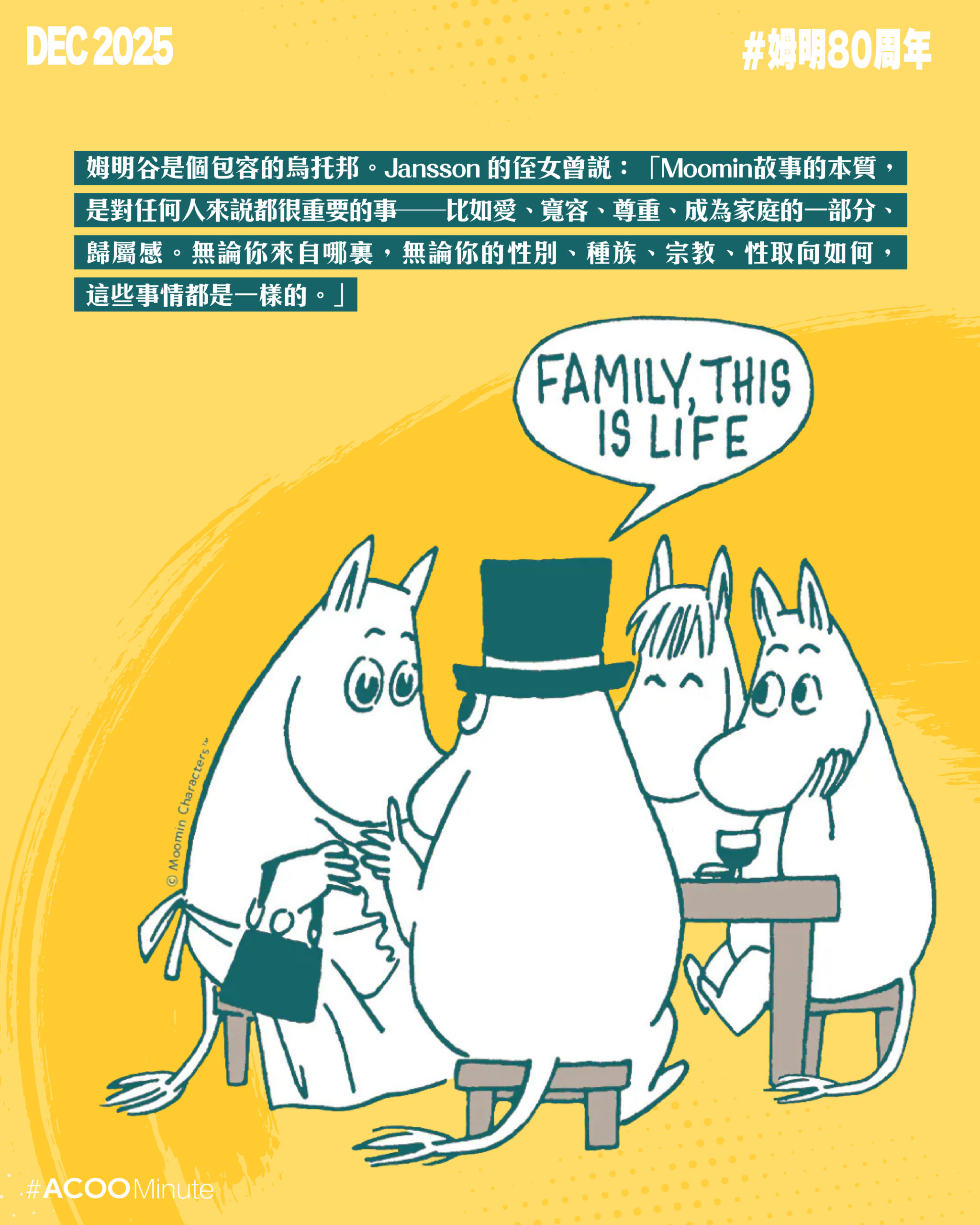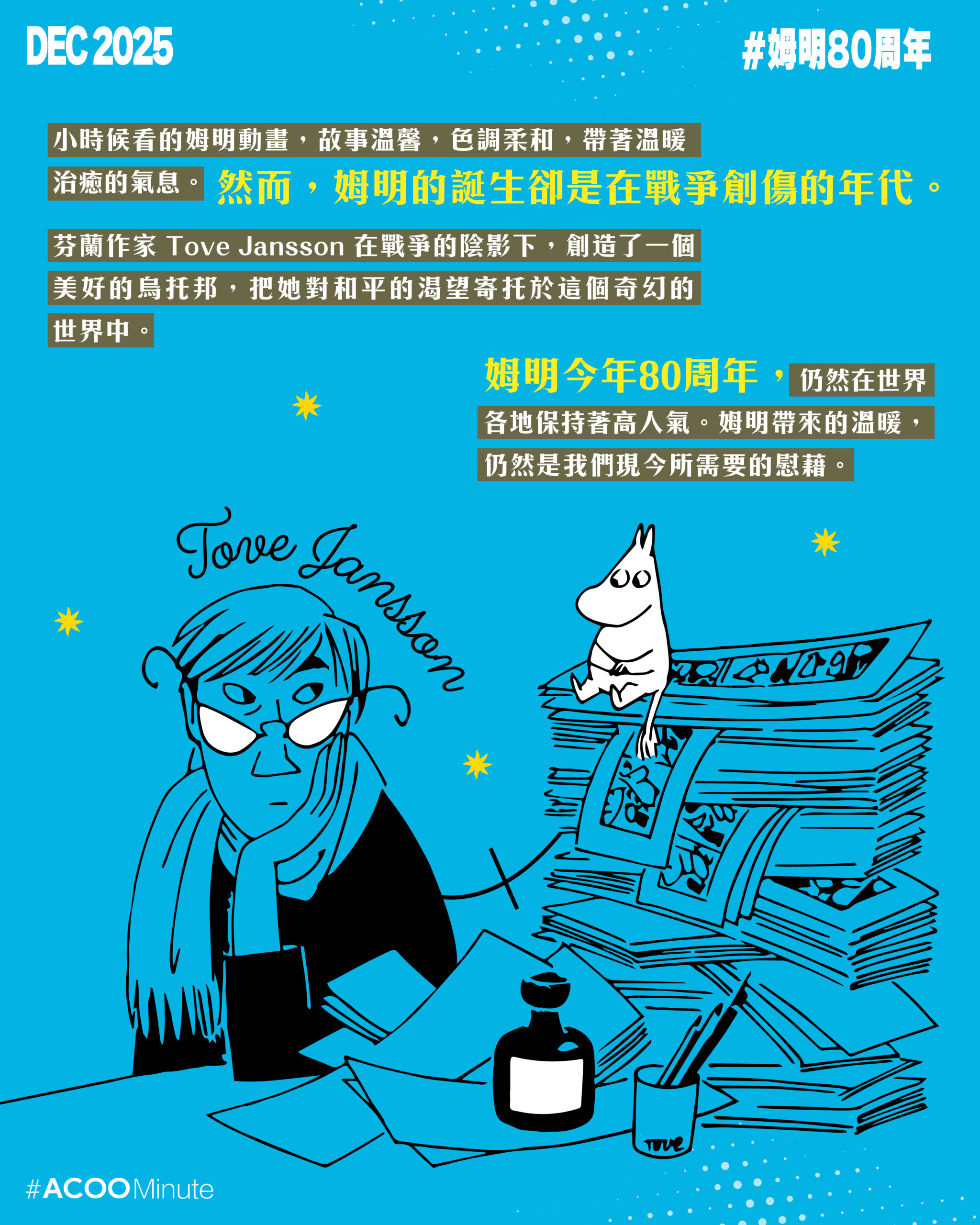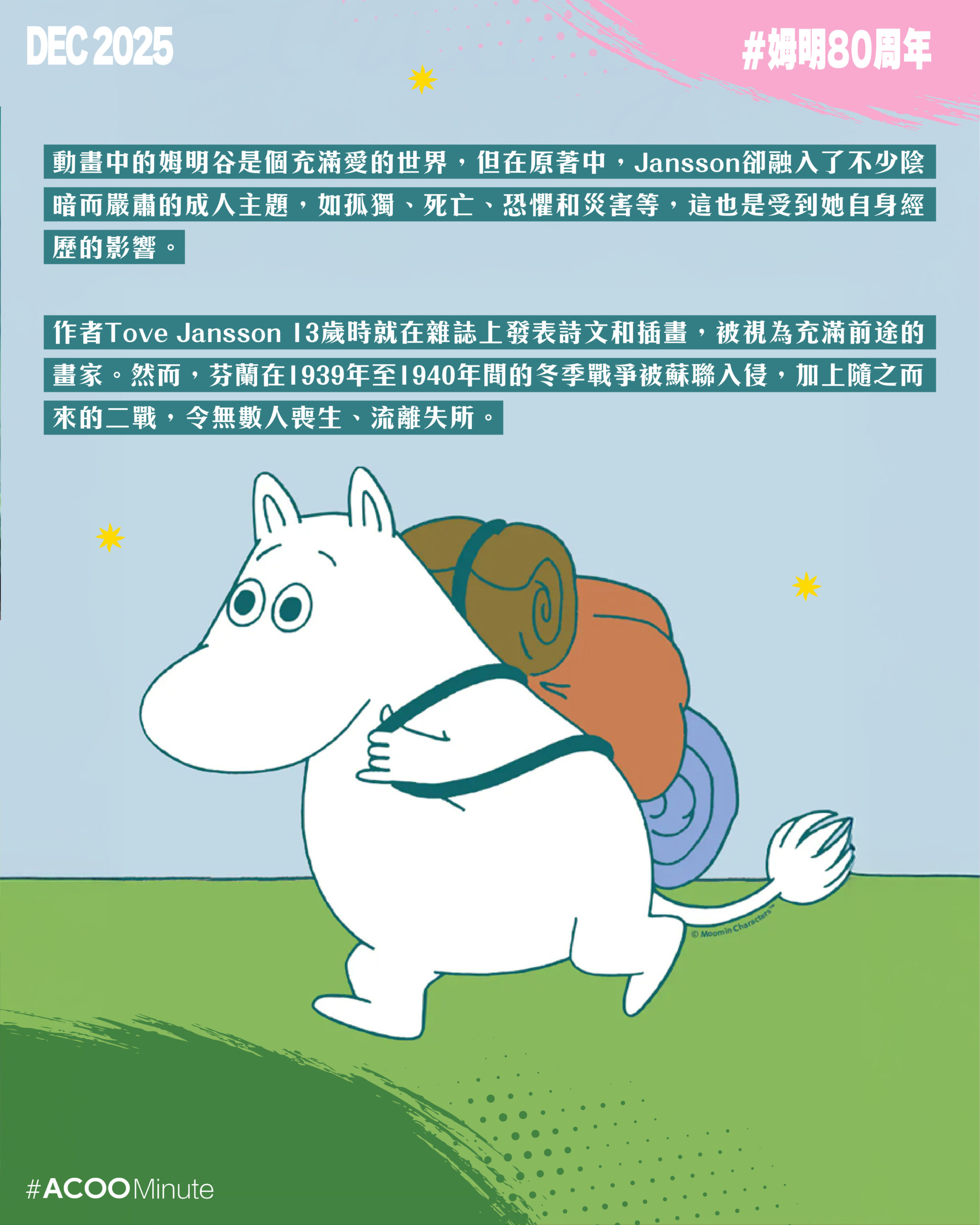 小時候看的姆明動畫,故事溫馨,色調柔和,帶著溫暖治癒的氣息。然而,姆明的誕生卻是在戰爭創傷的年代。芬蘭作家 Tove Jansson 在戰爭的陰影下,創造了一個美好的烏托邦,把她對和平的渴望寄托於這個奇幻的世界中。姆明今年80周年,仍然在世界各地保持著高人氣。姆明帶來的溫暖,仍然是我們現今所需要的慰藉。