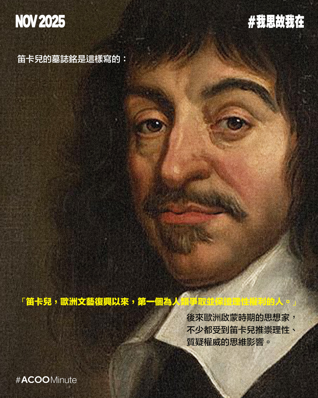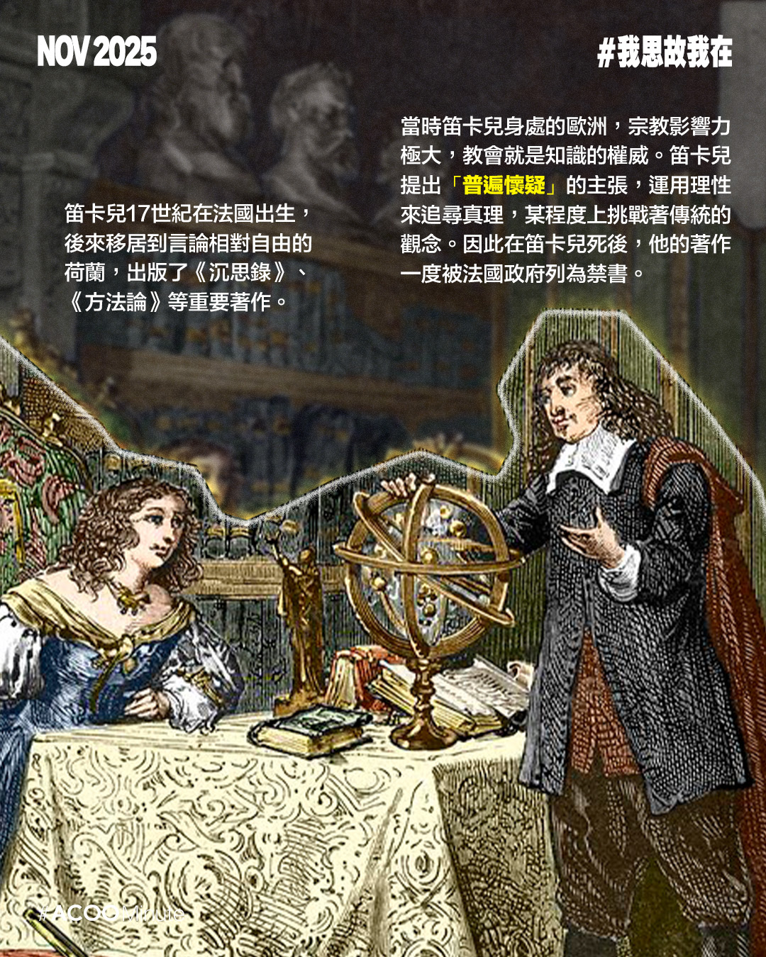 笛卡兒17世紀在法國出生,後來移居到言論相對自由的荷蘭,出版了《沉思錄》、《方法論》等重要著作。當時笛卡兒身處的歐洲,宗教影響力極大,教會就是知識的權威。笛卡兒提出「普遍懷疑」的主張,運用理性來追尋真理,某程度上挑戰著傳統的觀念。因此在笛卡兒死後,他的著作一度被法國政府列為禁書。笛卡兒的墓誌銘是這樣寫的:「笛卡兒,歐洲文藝復興以來,第一個為人類爭取並保證理性權利的人。」後來歐洲啟蒙時期的思想家,不少都受到笛卡兒推崇理性、質疑權威的思維影響。