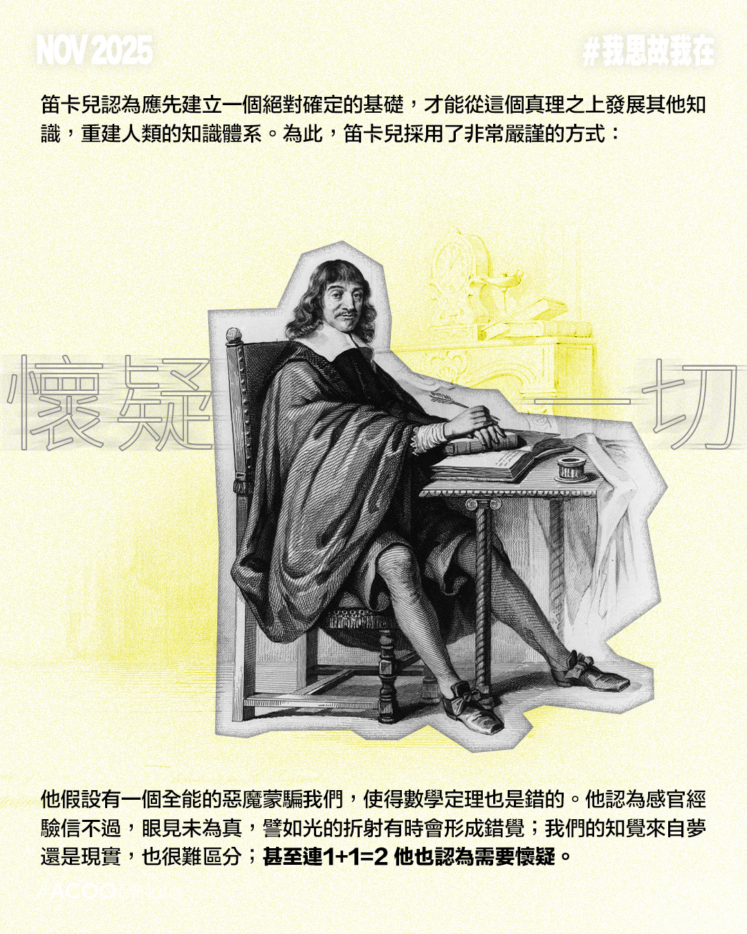 還記得中學數學的證明題,要應用各種公式和定理,一步步證明結論是否成立。笛卡兒自小對數學著迷,但同時認為所有學問的基礎都是哲學,所以他提倡以數學的方法進行哲學思考,像證明題一樣,以理性和邏輯達到真理。他認為應先建立一個絕對確定的基礎,才能從這個真理之上發展其他知識,重建人類的知識體系。