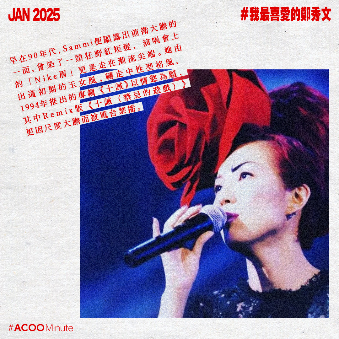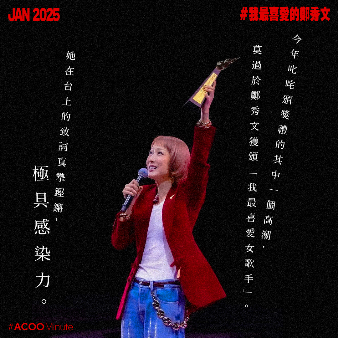 今年叱咤頒獎禮的其中一個高潮,莫過於鄭秀文獲頒「我最喜愛女歌手」。她在台上的致詞真摯鏗鏘,極具感染力。她說,這些年來一直依從內心,做想做的音樂,體會到只要帶著勇氣和堅持,就可以走出自己的人生路,又勉勵年輕歌手:「無論你而家身處咩光景、無論你係順境、逆境都好, 你繼續帶住呢份嘅堅持,你所相信嘅會將你帶到好遠嘅道路,甚至飛得好高、好遠。」出道超過30年,Sammi仍能贏得大家的喜愛,正因為她從未停止超越自我,勇於突破,才令她的魅力足以跨越世代,成為永不過時的天后。