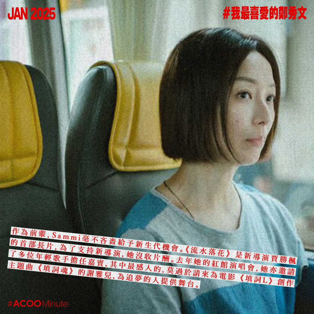 作為前輩,Sammi毫不吝嗇給予新生代機會。《流水落花》是新導演賈勝楓的首部長片,為了支持新導演,她沒收片酬。去年她的紅館演唱會,她亦邀請了多位年輕歌手擔任嘉賓,其中最感人的,莫過於請來為電影《填詞L》創作主題曲《填詞魂》的謝雅兒,為追夢的人提供舞台。無論在音樂還是影視界,她都在長江後浪推前浪,積極提攜新世代。