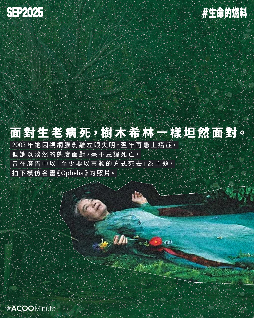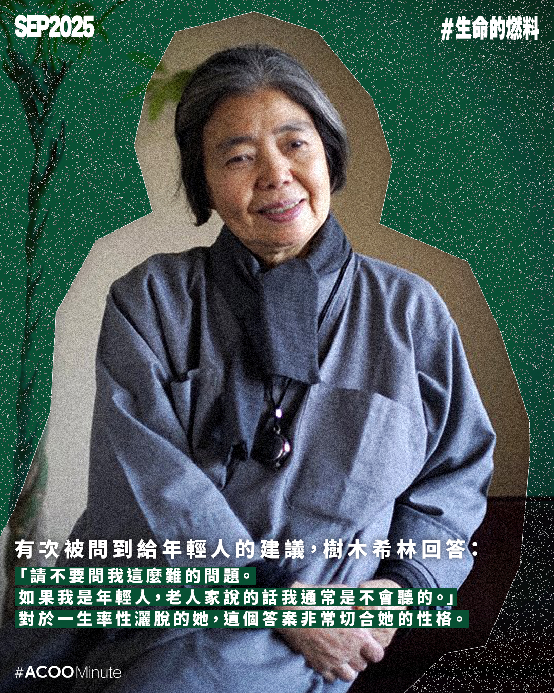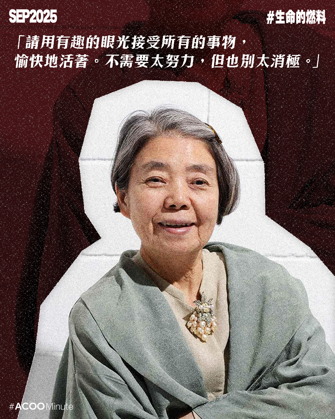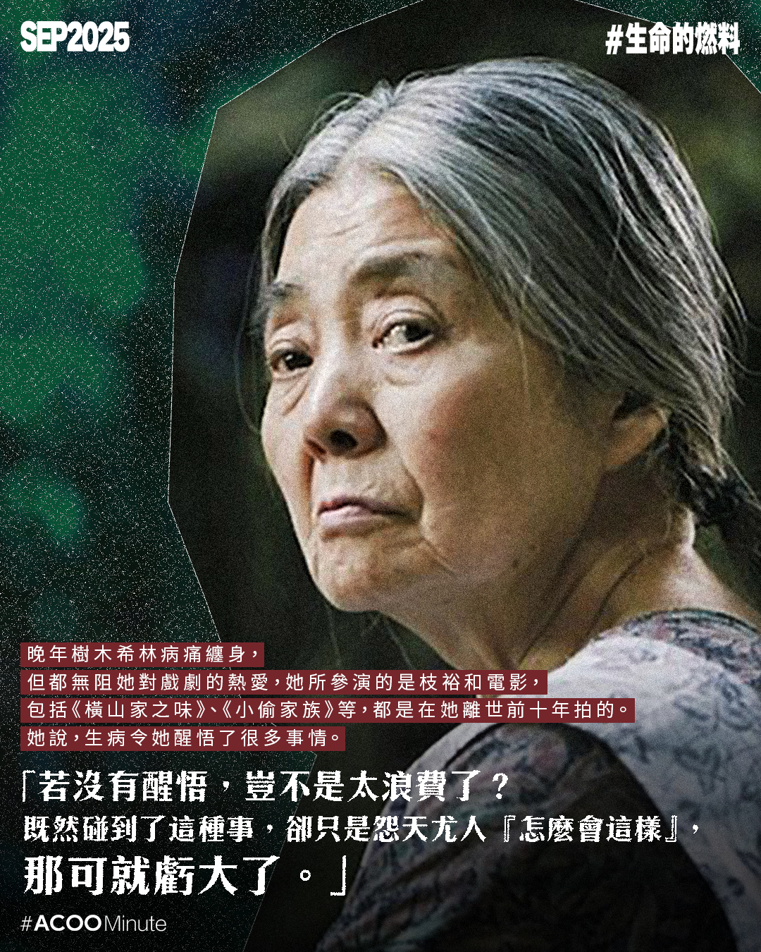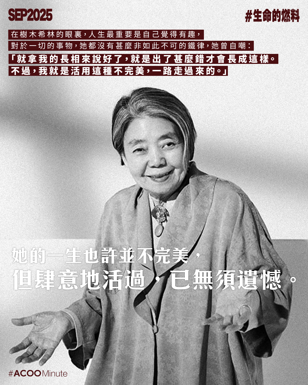 有次被問到給年輕人的建議,樹木希林回答:「請不要問我這麼難的問題。如果我是年輕人,老人家說的話我通常是不會聽的。」對於一生率性灑脫的她,這個答案非常切合她的性格。在她的眼裏,人生最重要是自己覺得有趣,對於一切的事物,她都沒有甚麼非如此不可的鐵律,更曾自嘲:「就拿我的長相來說好了,就是出了甚麼錯才會長成這樣。不過,我就是活用這種不完美,一路走過來的。」今年是樹木希林逝世7周年,她的一生也許並不完美,但肆意地活過,已無須遺憾。