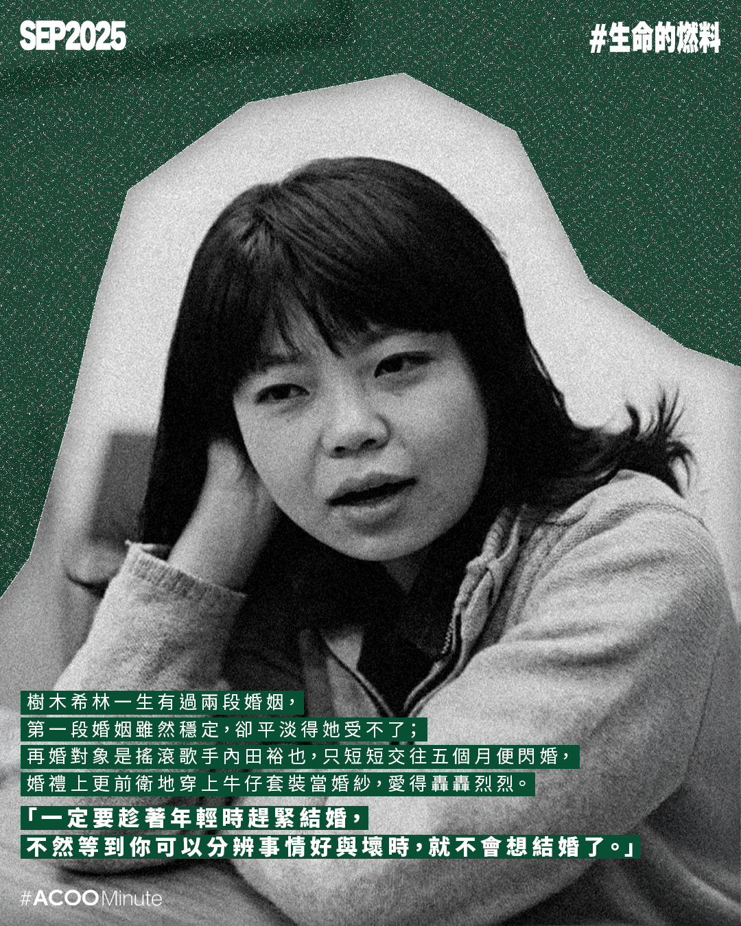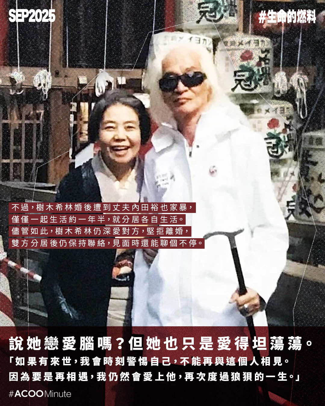她一生有過兩段婚姻,第一段婚姻雖然穩定,卻平淡得她受不了;再婚對象是搖滾歌手內田裕也,只短短交往五個月便閃婚,婚禮上更前衛地穿上牛仔套裝當婚紗,愛得轟轟烈烈。不過,她婚後遭到丈夫家暴,僅僅一起生活約一年半,就分居各自生活。儘管如此,樹木希林仍深愛對方,堅拒離婚,雙方分居後仍保持聯絡,見面時還能聊個不停。說她戀愛腦嗎?但她也只是愛得坦蕩蕩,「如果有來世,我會時刻警惕自己,不能再與這個人相見。因為要是再相遇,我仍然會愛上他,再次度過狼狽的一生。」