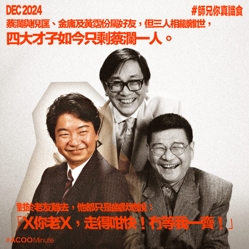 年輕人認識蔡瀾,可能是他的食評人身份,但其實他還是個電影製片人、作家、書法家、生意人,與金庸、倪匡及黃霑並列為香港四大才子。他在新加坡出生,在日本讀電影編導,22歲定居香港,曾在邵氏及嘉禾擔任電影製作,監製過一系列成龍電影,以及不少三級片、cult片如《力王》等。他八十年代開始寫作,以食評及遊記為主,主持過不少美食節目,亦曾與倪匡及黃霑主持清談節目《今夜不設防》,在文化界地位舉足輕重。