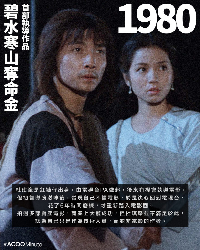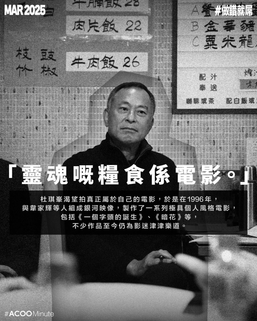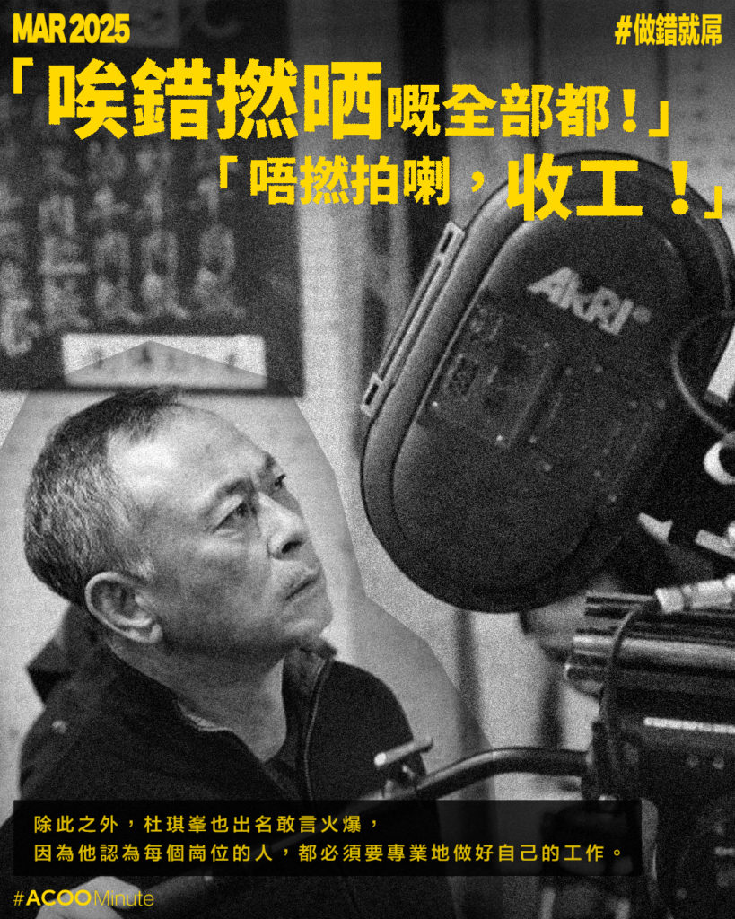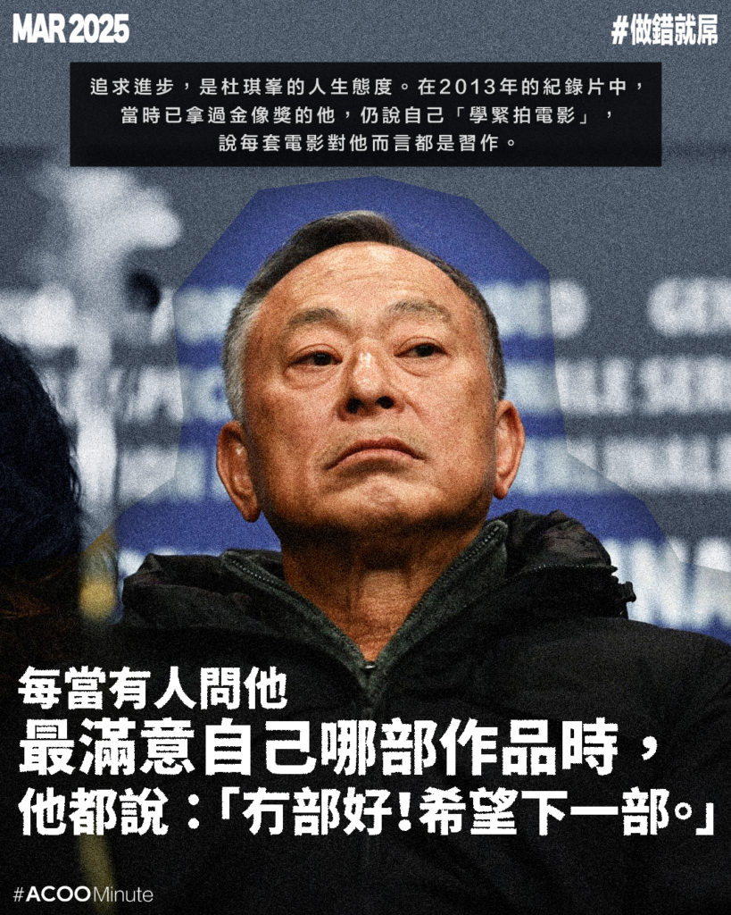 杜琪峯數年未有新作,近日有日媒報道,杜Sir將開拍一部圍繞香港黑幫的作品,影迷都翹首以待。杜琪峯出名敢言火爆,數年前他在節目《鏗鏘說》中展示自己辦公室中的一張橫幅,橫幅上的字被網民惡搞改為「做錯就屌」,在網上廣為流傳。(翻查才記起,原有的字其實是「止於至善」。)大家對杜Sir之所以有此印象,大概來自2013年一套有關他的紀錄片。片中他因為現場工作人員不專業的表現而爆粗怒罵,有些罵人語錄被網民cap圖引用,以至他的火爆形象深入民心。