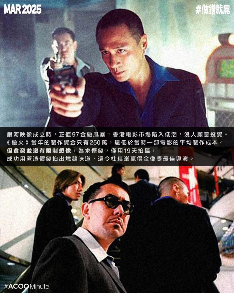 銀河映像成立時,正值97金融風暴,香港電影市場陷入低潮,沒人願意投資。銀河映像也經歷了一段艱難的時期,幾乎連租也交不起。《鎗火》當年的製作資金只有250萬,遠低於當時一部電影的平均製作成本。但貧窮並沒有限制想像,為求慳錢,《鎗火》僅用了19天拍攝,成功用蔗渣價錢拍出燒鵝味道,還令杜Sir贏得金像獎最佳導演。