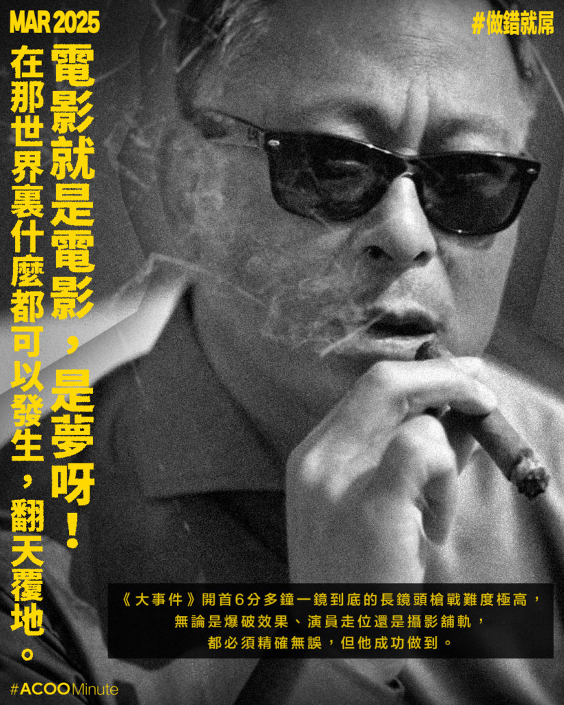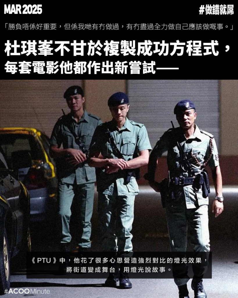 杜Sir不甘於複製成功方程式,每套電影他都作出新嘗試。例如《PTU》中,他花了很多心思營造強烈對比的燈光效果,將街道變成舞台,用燈光說故事;《大事件》開首6分多鐘一鏡到底的長鏡頭槍戰難度極高,無論是爆破效果、演員走位還是攝影舖軌,都必須精確無誤,但他成功做到,「如果我怕困難,可能有啲嘢就唔會出現。」