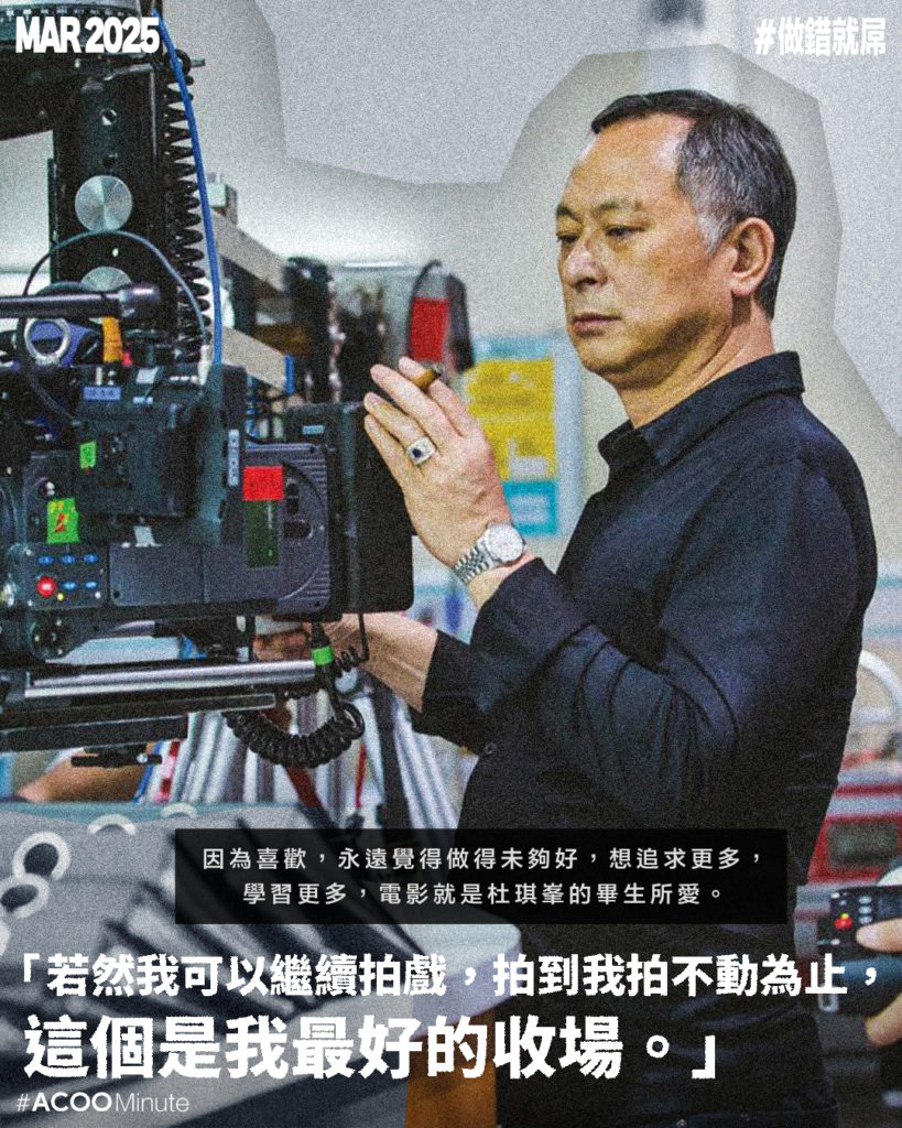 因為喜歡,永遠覺得做得未夠好,想追求更多,學習更多。電影是他的畢生所愛,「若然我可以繼續拍戲,拍到我拍不動為止,這個是我最好的收場。」杜Sir用他的電影人生,鼓吹大家浪漫地追求所愛,「你好努力去做,有信念,就算終歸達成唔到,至少你對自己有交代。」