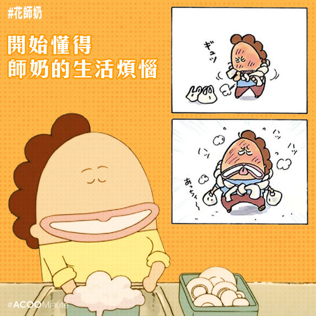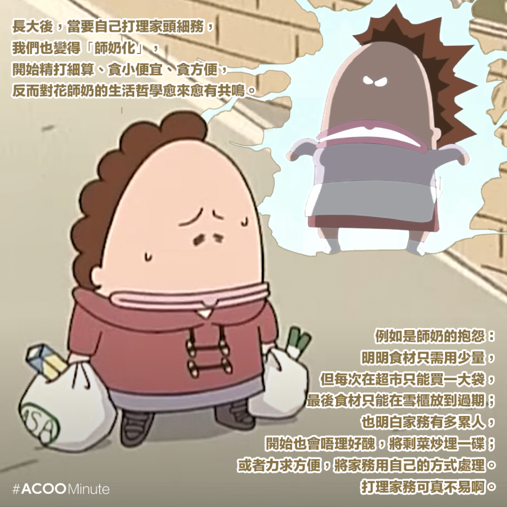 從前看的時候,多數會在阿柑阿桔身上找到共鳴,因為花師奶的性格行徑有時就像我們阿媽,我們會跟著阿柑阿桔一起吐槽花師奶。長大後,當要自己打理家頭細務,我們也變得「師奶化」,開始精打細算、貪小便宜、貪方便,反而對花師奶的生活哲學愈來愈有共鳴。例如是師奶的抱怨:明明食材只需用少量,但每次在超市只能買一大袋,最後食材只能在雪櫃放到過期;也明白家務有多累人,開始也會唔理好醜,將剩菜炒埋一碟;或者力求方便,將家務用自己的方式處理。打理家務可真不易啊。