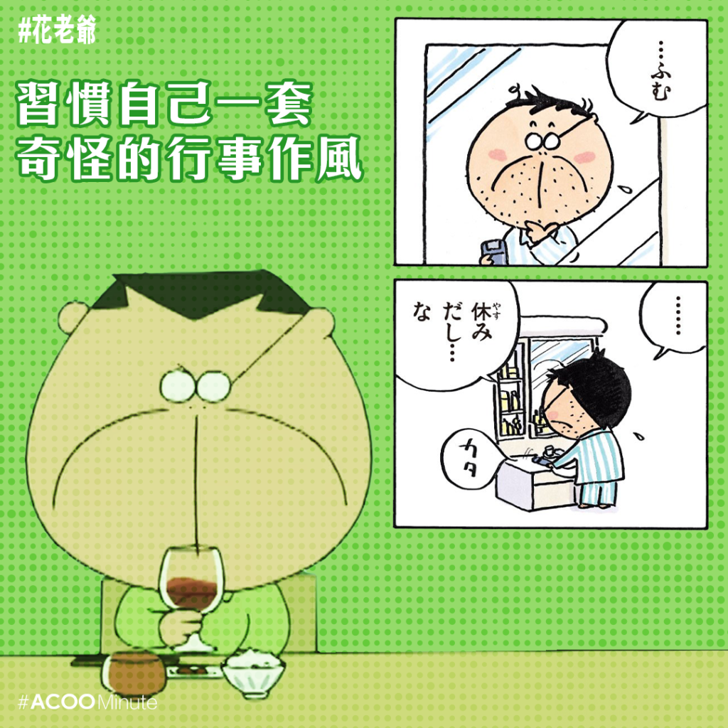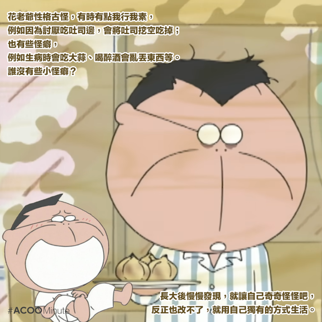 花老爺性格古怪,有時有點我行我素,例如因為討厭吃吐司邊,會將吐司挖空吃掉;也有些怪癖,例如生病時會吃大蒜、喝醉酒會亂丟東西等。誰沒有些小怪癖?長大後慢慢發現,就讓自己奇奇怪怪吧,反正也改不了,就用自己獨有的方式生活。