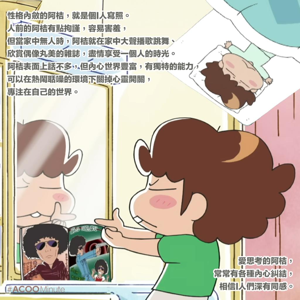 性格內斂的阿桔,就是個I人寫照。人前的阿桔有點拘謹,容易害羞,但當家中無人時,阿桔就在家中大聲播歌跳舞、欣賞偶像丸美的雜誌,盡情享受一個人的時光。阿桔表面上話不多,但內心世界豐富,有獨特的能力,可以在熱鬧聒噪的環境下關掉心靈開關,專注在自己的世界。愛思考的阿桔,常常有各種內心糾結,相信I人們深有同感。