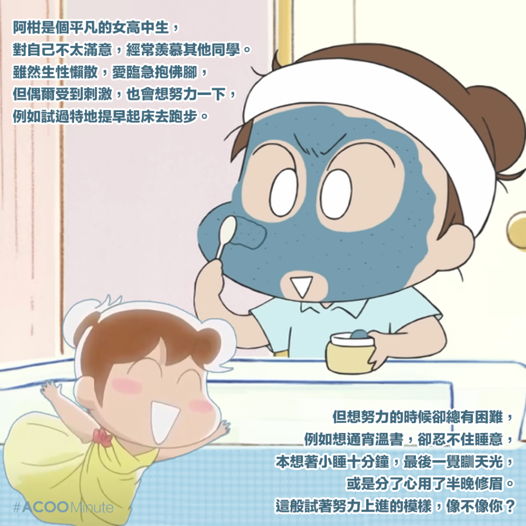 阿柑是個平凡的女高中生,對自己不太滿意,經常羨慕其他同學。雖然生性懶散,愛臨急抱佛腳,但偶爾受到刺激,也會想努力一下,例如試過特地提早起床去跑步。但想努力的時候卻總有困難,例如想通宵溫書,卻忍不住睡意,本想著小睡十分鐘,最後一覺瞓天光,或是分了心用了半晚修眉。這般試著努力上進的模樣,像不像你?
