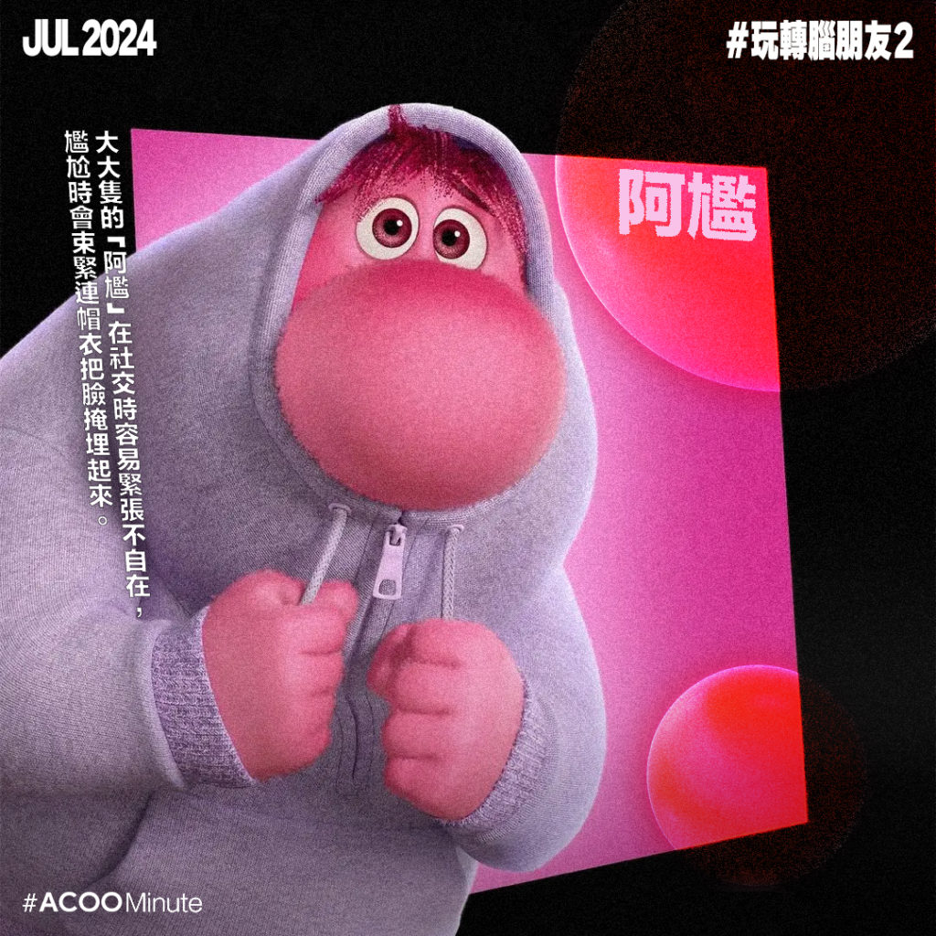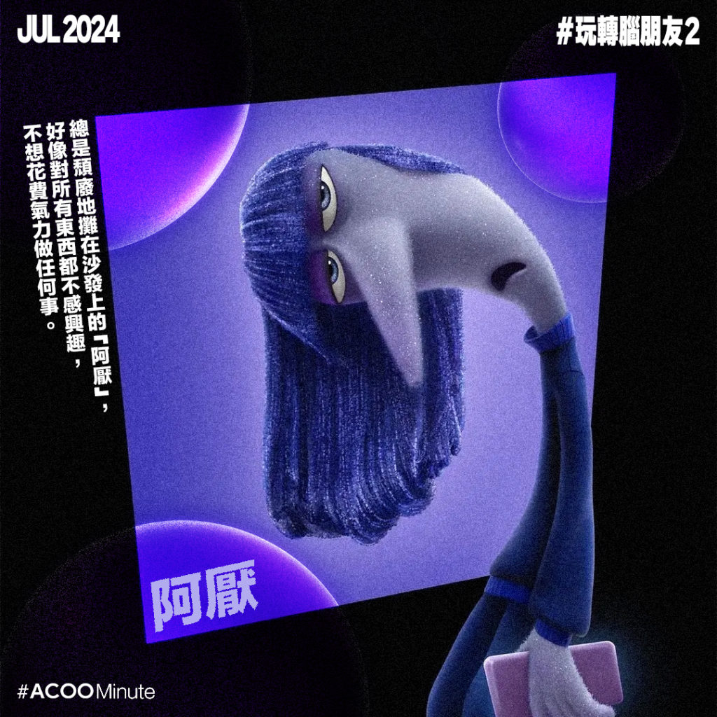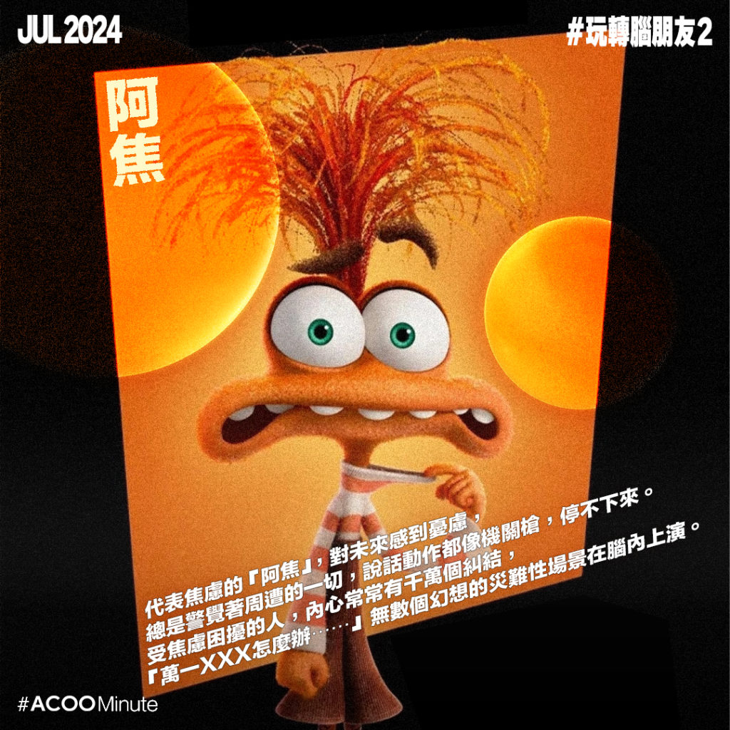 代表焦慮的「阿焦」,對未來感到憂慮,總是警覺著周遭的一切,說話動作都像機關槍,停不下來。受焦慮困擾的人,內心常常有千萬個糾結,「萬一XXX怎麼辦⋯⋯」無數個幻想的災難性場景在腦內上演。焦慮聽來負面,但也有正面作用。焦慮其實是種生存本能,因為憂慮未來,於是會制定不同計劃作準備,以更好的應對挑戰。但如果過度焦慮,就變相被焦慮支配,無法控制情緒。焦慮無法避免,但有些焦慮是不必要的,學會接受有些事就是無法控制,大多數幻想的情景也只是幻想,即使真的發生了,後果也沒有想像中糟糕,做了應做的準備就好。