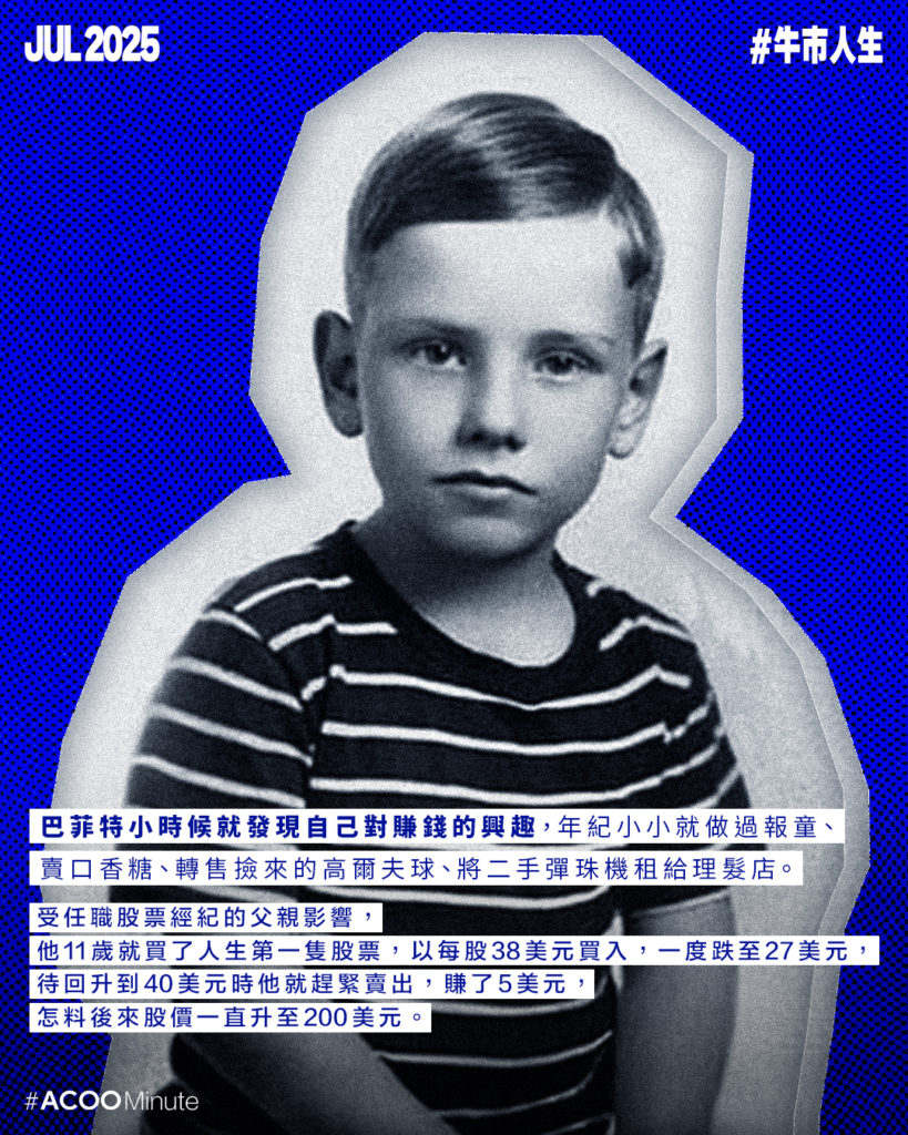 巴菲特小時候就發現自己對賺錢的興趣,年紀小小就做過報童、賣口香糖、轉售撿來的高爾夫球、將二手彈珠機租給理髮店。大學畢業後,他做過投資推銷員及證券分析師,後來成立投資合伙企業,以低價買入優質公司並長期持有,逐漸累積財富。受任職股票經紀的父親影響,他11歲就買了人生第一隻股票,以每股38美元買入,一度跌至27美元,待回升到40美元時他就趕緊賣出,賺了5美元,怎料後來股價一直升至200美元。這場教訓令他意識到,投資時最重要是保持冷靜。他的名言之一「別人恐懼我貪婪,別人貪婪我恐懼」,亦是強調情緒控制的重要性,不要盲目追捧熱潮,在恐慌之中抓緊機會。