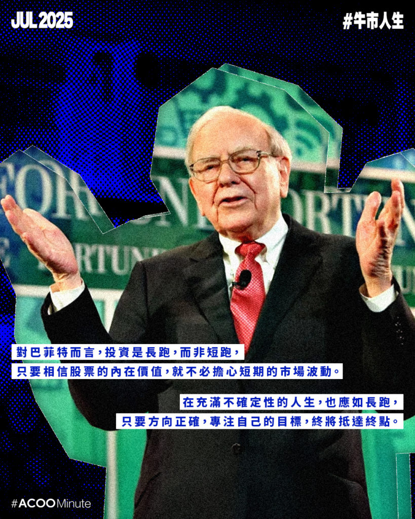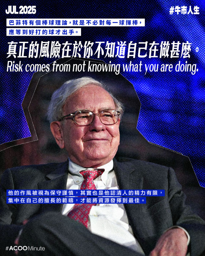 道理我們都懂,但現實是知易行難。人群是那麼像羊群,在人生路上,當人人追捧著某一種價值時,如你沒有跟在潮流內,內心必然有所動搖,質疑自己的路向是否正確。不跟潮流的股神也有被質疑的時候,不時被嘲笑錯失股市的巨幅升浪。九十年代末,當多數人爭相投資科技股,他堅持不買,因為自己不投資不熟悉的行業,當時他被嘲笑跟不上時代,但後來科網股爆破,旁人又讚歎「薑還是老的辣」。他有個棒球理論,就是不必對每一球揮棒,應等到好打的球才出手。他的作風被視為保守謹慎,其實也是他認清人的精力有限,集中在自己的擅長的範疇,才能將資源發揮到最佳。「真正的風險在於你不知道自己在做甚麼」,潮流來去如風,盲目跟風,只會耗損自己的時間與精力。唯有看清方向,才能穩步前行。
