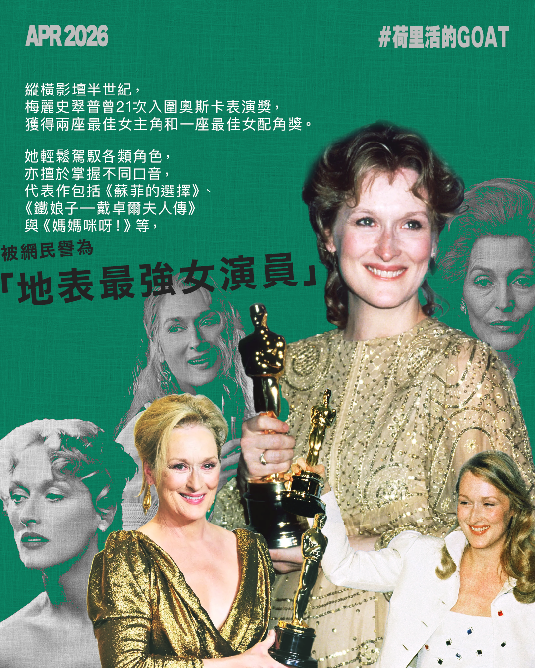 76歲的梅麗史翠普,被荷里活影星稱呼為GOAT(Greatest of All Time),縱橫影壇半世紀,曾21次入圍奧斯卡表演獎,獲得兩座最佳女主角和一座最佳女配角獎。她輕鬆駕馭各類角色,亦擅於掌握不同口音,代表作包括《蘇菲的選擇》、《鐵娘子—戴卓爾夫人傳》與《媽媽咪呀!》等,被網民譽為「地表最強女演員」。