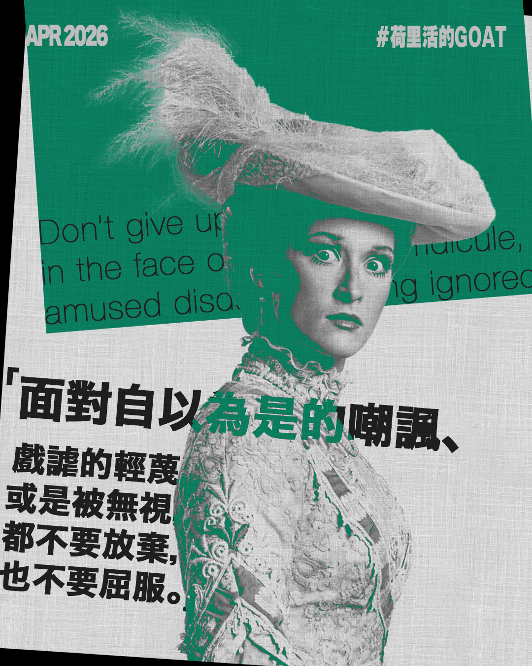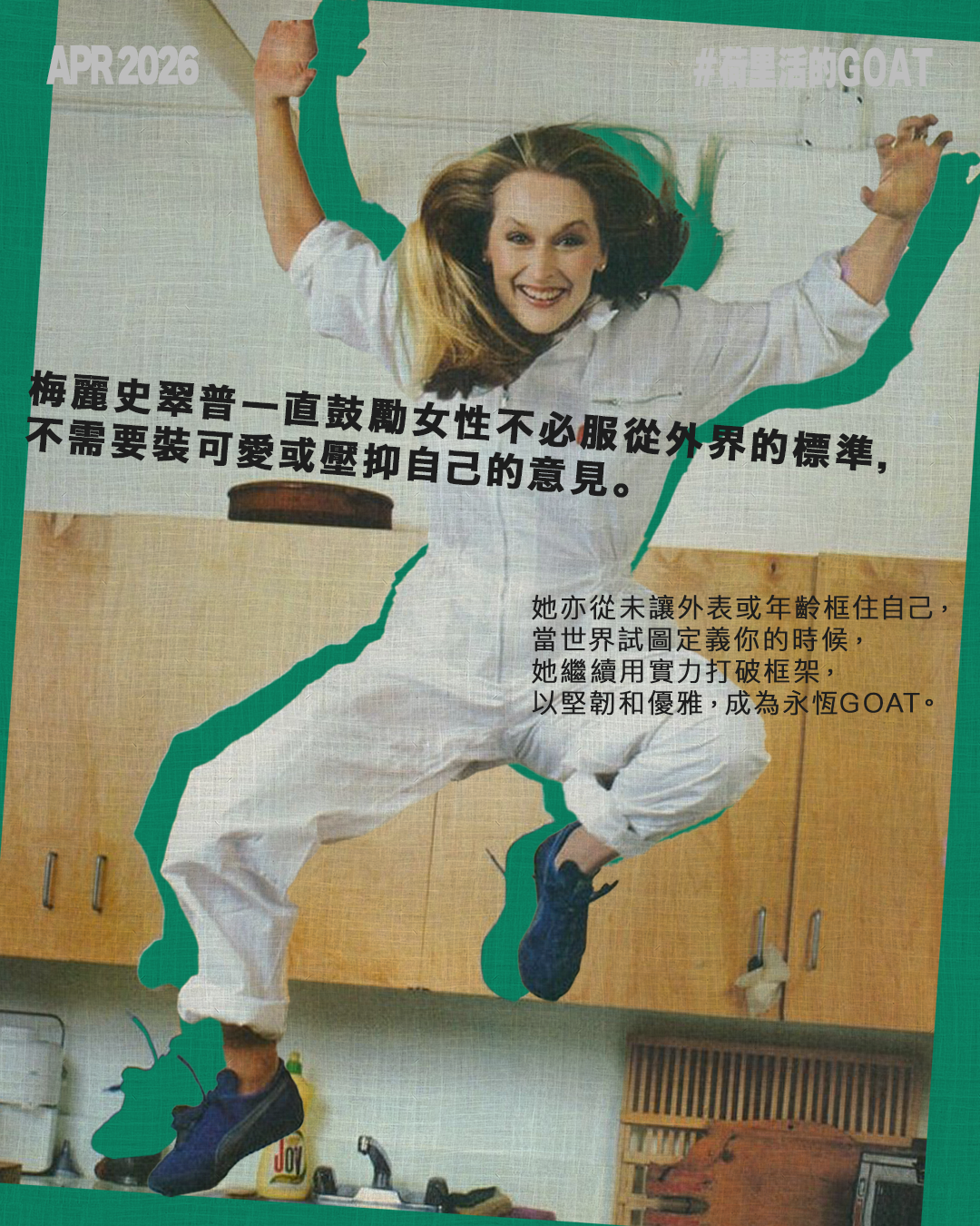 梅麗史翠普一直鼓勵女性不必服從外界的標準,不需要裝可愛或壓抑自己的意見。她亦從未讓外表或年齡框住自己,「面對自以為是的嘲諷、戲謔的輕蔑,或是被無視,都不要放棄,也不要屈服。」當世界試圖定義你的時候,她繼續用實力打破框架,以堅韌和優雅,成為永恆GOAT。